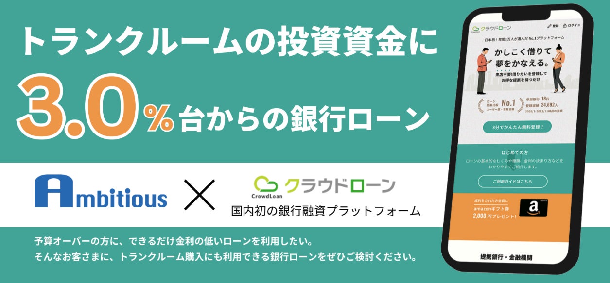 屋内型トランクルーム店舗数No.1※1のトランクルーム「収納ピット」を展開する株式会社アンビシャス (本社所在地︓大阪府⼤阪市中央区、代表︓徳永 暢也、以下「収納ピット」)は、国内初の銀行融資プラットフォーム「クラウドローン」を運営するクラウドローン株式会社(本社所在地︓東京都新宿区、代表︓村田 大輔、以下「クラウドローン」)と提携し、トランクルーム投資に興味のある個人投資家が融資500万円まで受けられるサービスの提供を開始しました。