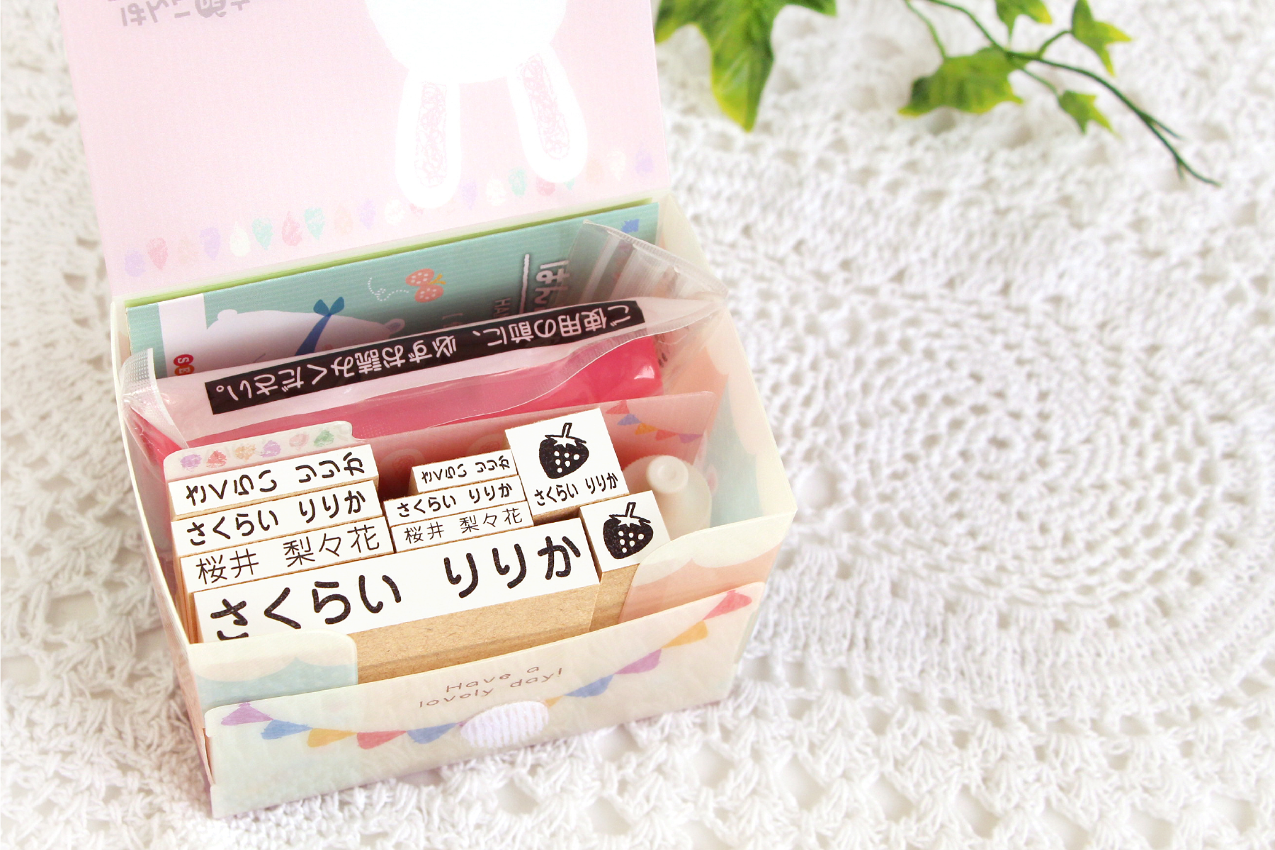 お名前スタンプを立てて収納できるオリジナルケースの絵柄はシロクマ・ウサギ・なちゅらるBOXのいずれかからお好みでチョイスできます。
