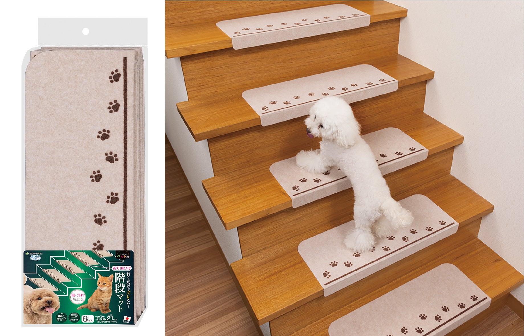 今回のイチオシ商品「おくだけ吸着階段マット 肉球」は折り曲げ付きで階段の角がカバーでき、やさしいソフトな踏み心地のマットです。裏面が吸着してズレないところも特長です!