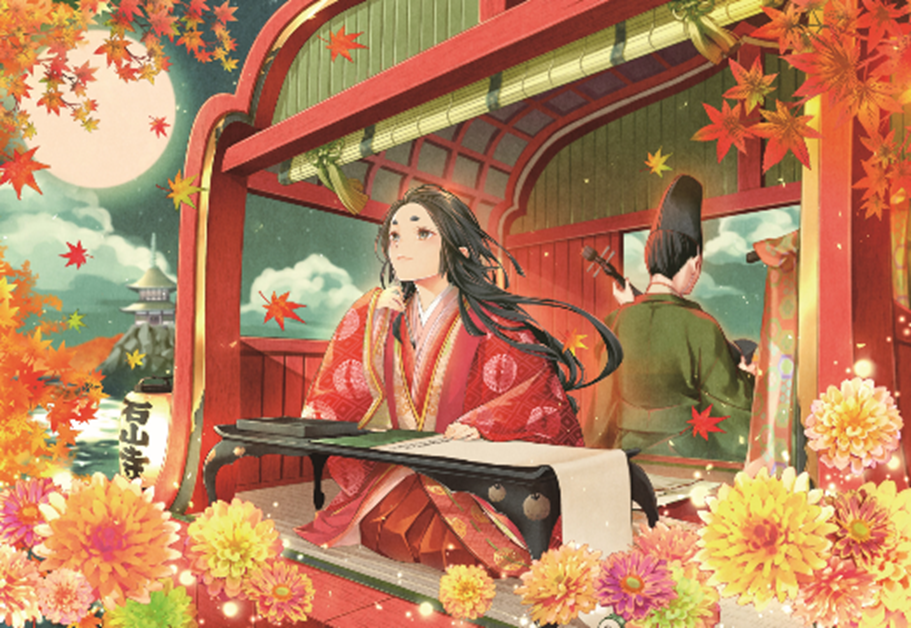 紫式部が石山寺に参籠している際、中秋の月がびわ湖に浮かぶ様子を見て、「今宵は十五夜なりけり」と書き出したのが「源氏物語」の始まりだったといわれています。その場面をイメージしたイラストをびわ湖大津ふるさと観光大使である唐々煙氏に描き下ろしていただきました。