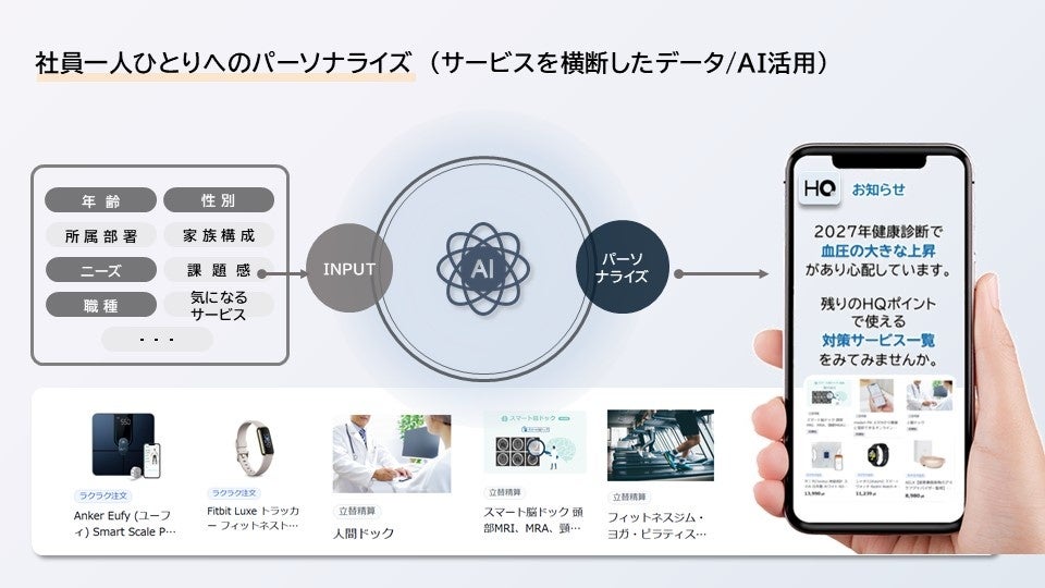 HQシリーズを横断してご利用いただくことで、ユーザーのデータが蓄積され、搭載したAIがそれらのデータを活用し、ユーザー一人ひとりに最適な提案を行います。
