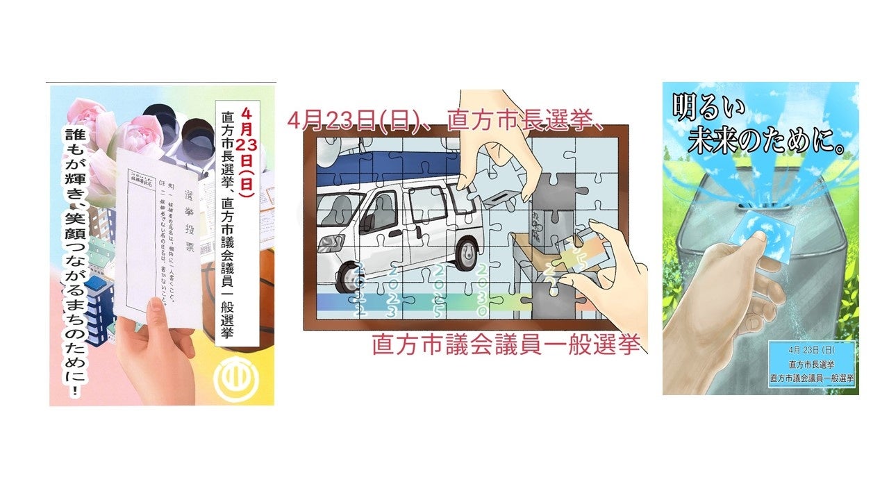 直方市では、4月23日(日)に直方市長選挙及び直方市議会議員選挙が執行されます。若い世代への選挙啓発の一環として市内の高校(鞍手高校、直方高校)の美術部に、投票を呼び掛ける選挙ポスターの作成を依頼し、完成品を受け取りました。このポスターは市内各所に掲示する予定です。