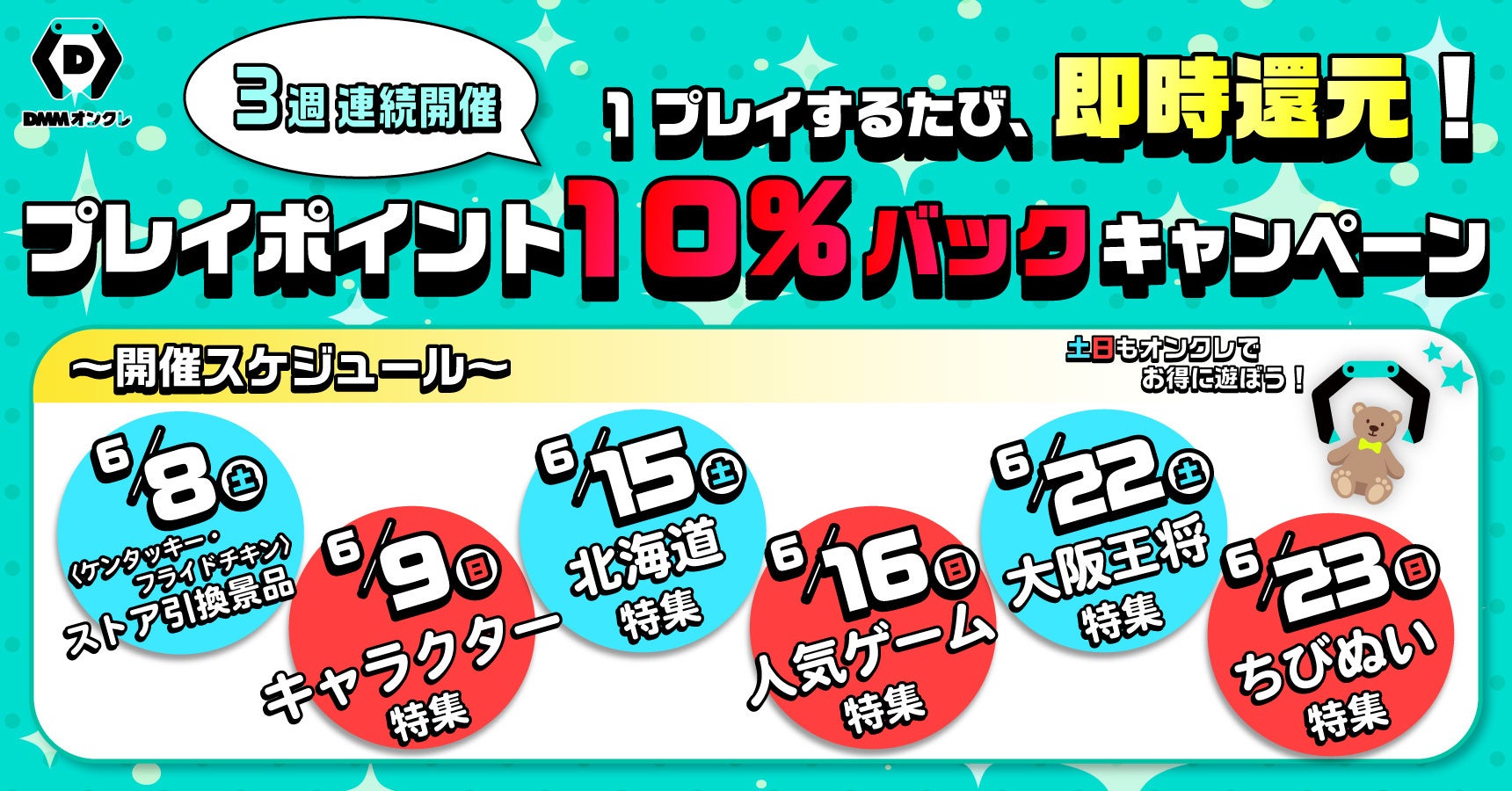 期間中、対象のプライズをプレイした際に消費したDMMポイントまたはDCのうち、10%分を即時還元します。