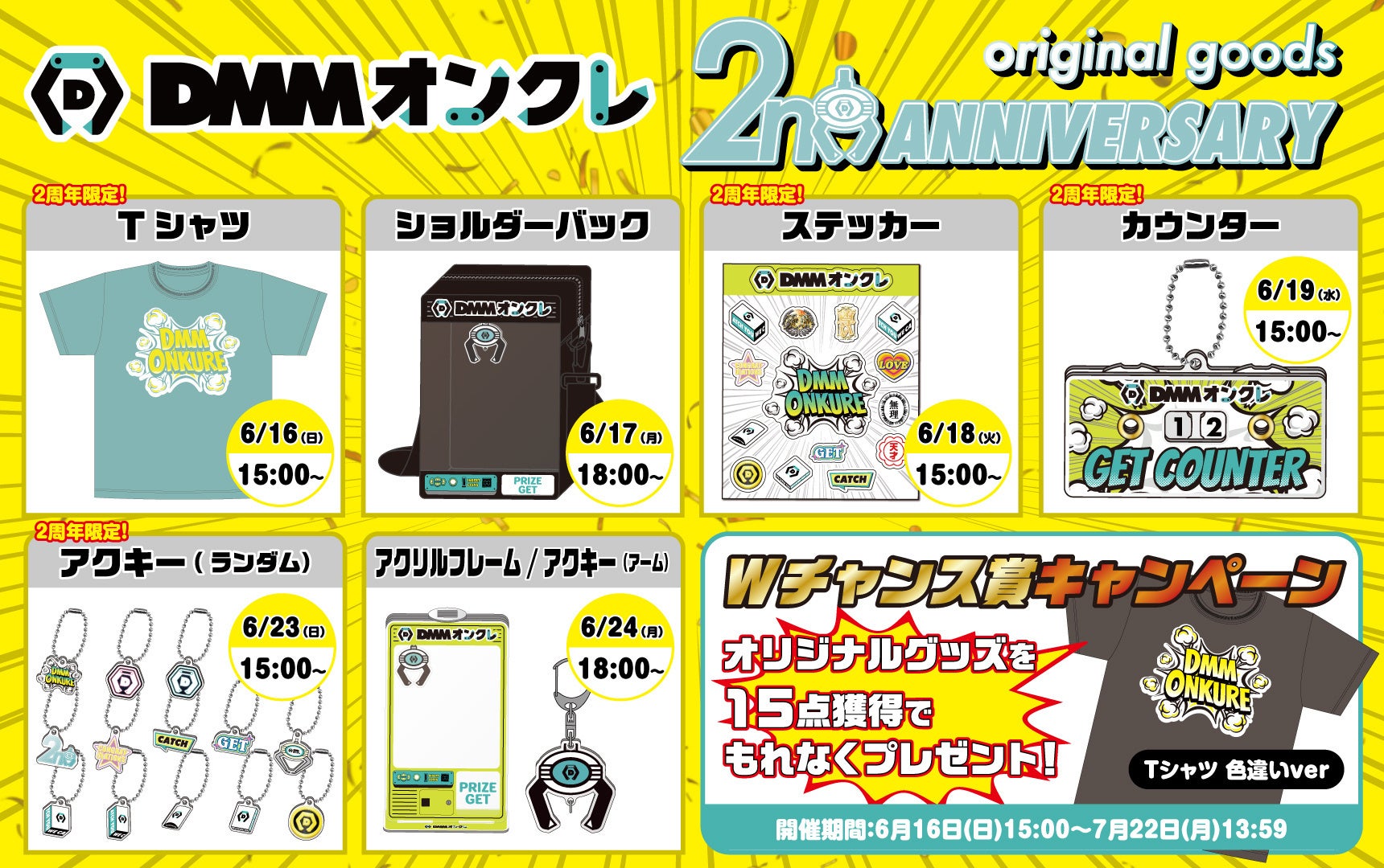 2周年限定デザインのTシャツや、ゲットした景品数をカウントできるアクリルキーホルダーのほか、推し活にも使えるステッカーやショルダーバッグなど、DMMオンクレのロゴをあしらったオリジナルグッズを期間限定で展開します。