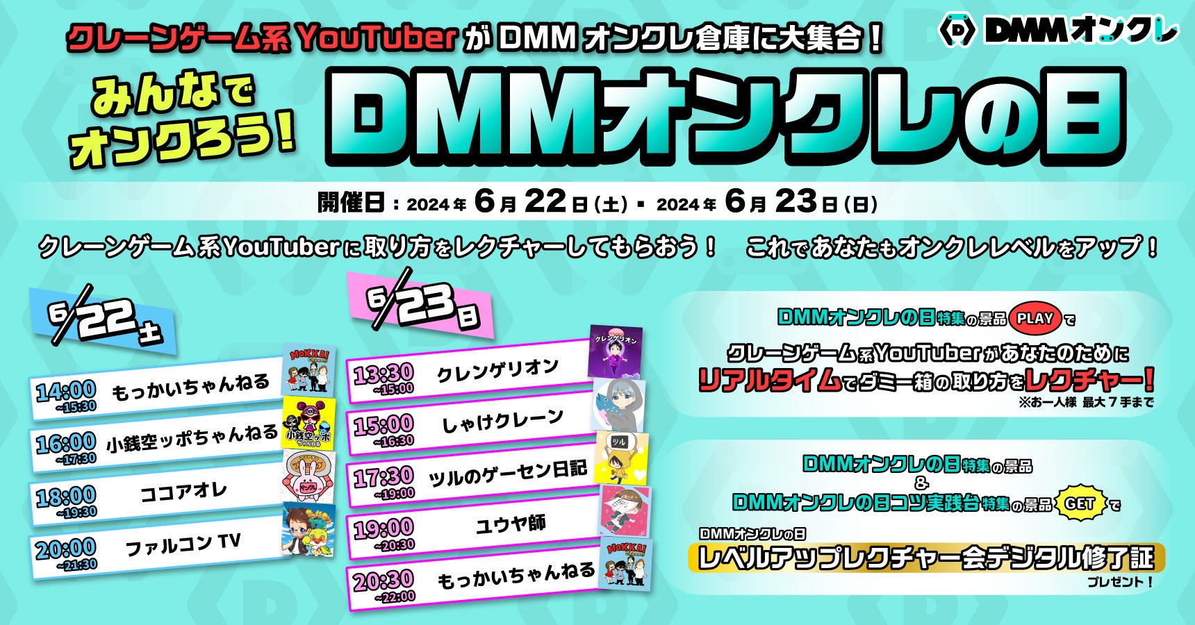 2022年6月23日にサービスを開始したDMMオンクレは、今年で2周年を迎えます。それを記念して、クレーンゲーム系YouTuber8組がDMMオンクレ倉庫に大集合し、プレイ中の方にその場で景品獲得のコツをレクチャーする「DMMオンクレの日」を開催いたします。レクチャーの様子は各YouTuberのチャンネルから生配信する予定です。