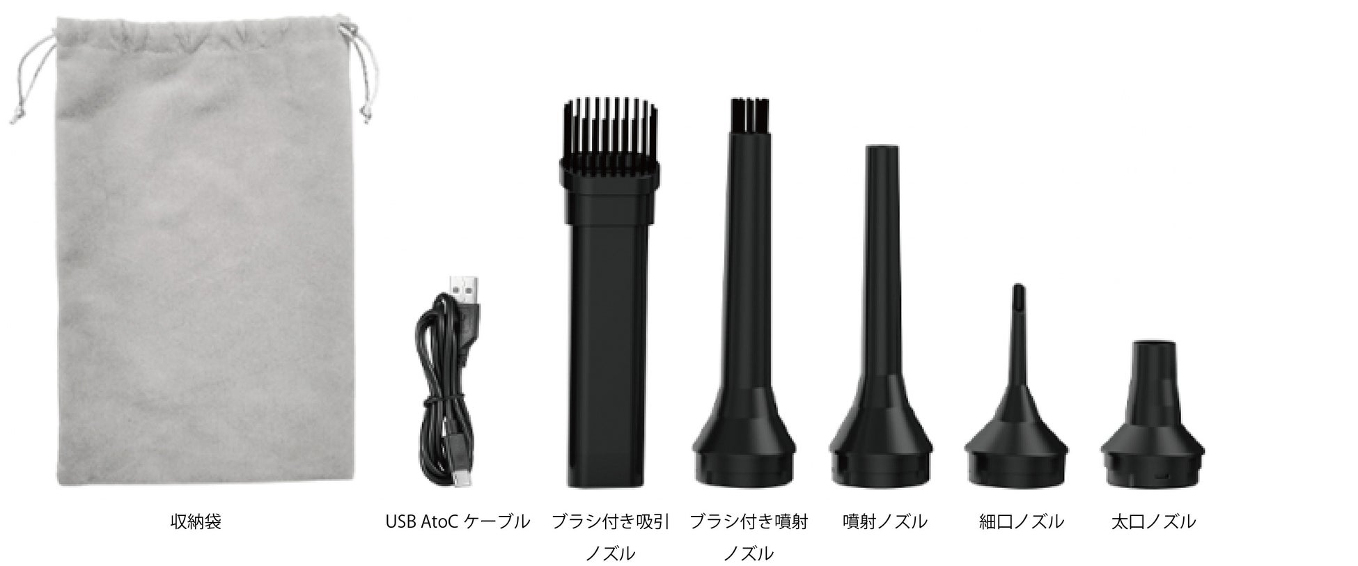ノズル5種 (噴射ノズル、ブラシ付き噴射ノズル、細口ノズル、太口ノズル、ブラシ付き吸引ノズル) 収納袋、USB AtoCケーブル |