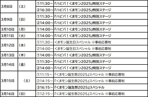 くまモンスクエアでは、「ハピバ!くまモン2025」期間中(3月8日(土)~3月16日(日))、特別ステージを開催します。3月12日(水)の誕生日当日や、「くまモン誕生祭2025」当日は、事前応募制のスペシャルステージも開催。