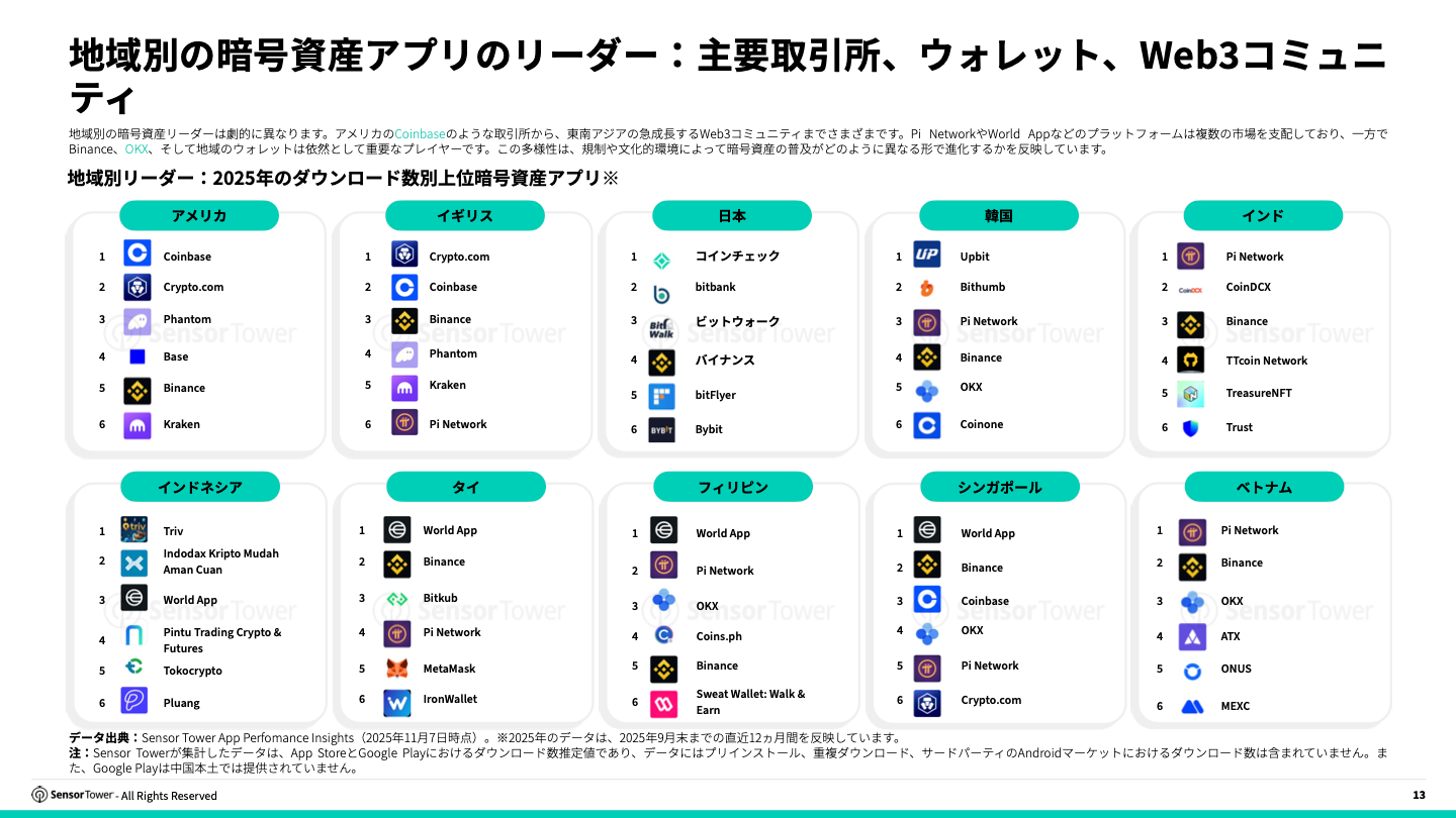 地域別の暗号資産リーダーは劇的に異なります。アメリカのCoinbaseのような取引所から、東南アジアの急成長するWeb3コミュニティまでさまざまです。Pi NetworkやWorld Appなどのプラットフォームは複数の市場を支配しており、一方でBinance、OKX、そして地域のウォレットは依然として重要なプレイヤーです。この多様性は、規制や文化的環境によって暗号資産の普及がどのように異なる形で進化するかを反映しています。