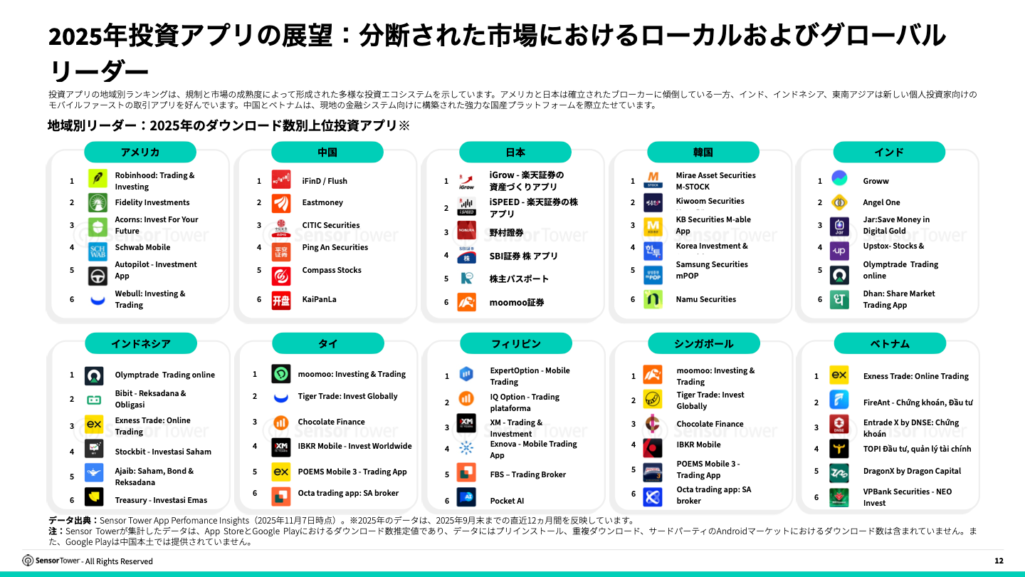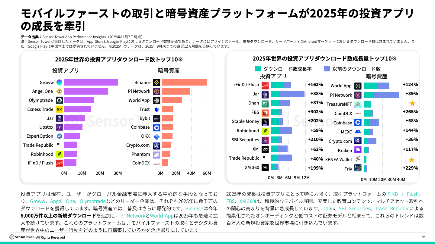 2025年の成長は投資アプリにとって特に力強く、取引プラットフォームのiFIND / Flush、FBS、XM 360は、積極的なモバイル展開、充実した教育コンテンツ、マルチアセット取引への関心の高まりを背景に急成長しています。Dhan、SBI証券、Trade Republicによる簡素化されたオンボーディングと低コストの証券モデルと相まって、これらのトレンドは数百万人の新規投資家を世界市場に引き込んでいます。