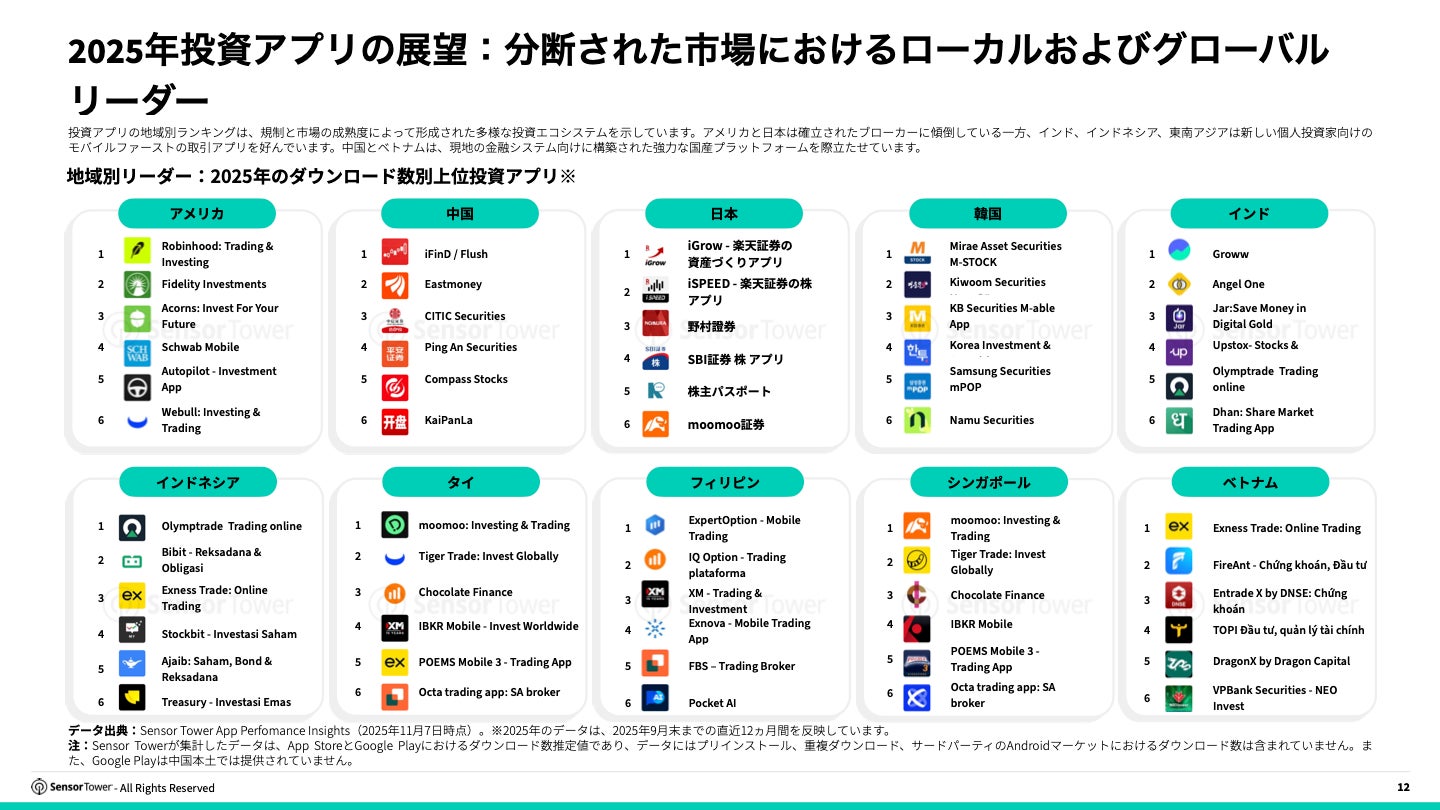 投資アプリの地域別ランキングは、規制と市場の成熟度によって形成された多様な投資エコシステムを示しています。アメリカと日本は確立されたブローカーに傾倒している一方、インド、インドネシア、東南アジアは新しい個人投資家向けのモバイルファーストの取引アプリを好んでいます。中国とベトナムは、現地の金融システム向けに構築された強力な国産プラットフォームを際立たせています