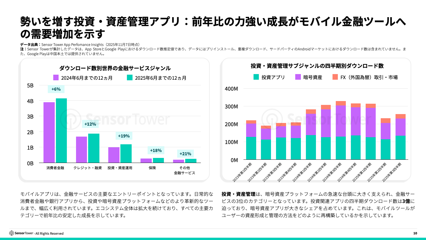 モバイルアプリは金融サービスの主要なエントリーポイントとなっており、日常的な消費者金融や銀行アプリから、投資や暗号資産プラットフォームなどのより革新的なツールまで多岐にわたります。エコシステム全体は拡大を続けており、すべての主要カテゴリーで前年比の安定した成長を示しています。