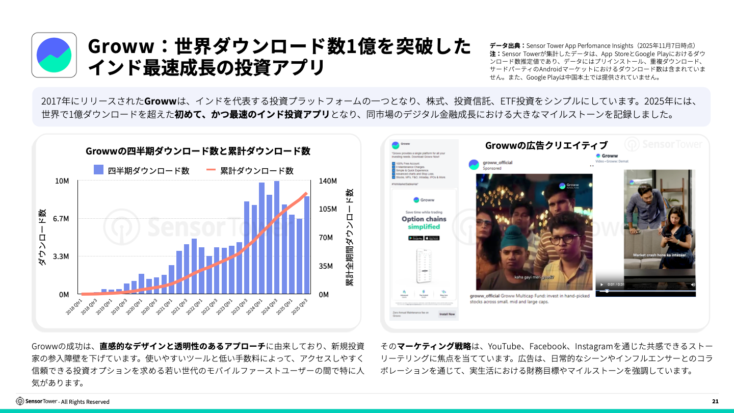 2017年にリリースされたGrowwは、インドを代表する投資プラットフォームの一つとなり、株式、投資信託、ETF投資をシンプルにしています。2025年には、世界で1億ダウンロードを超えた初めて、かつ最速のインド投資アプリとなり、同市場のデジタル金融成長における大きなマイルストーンを記録しました。