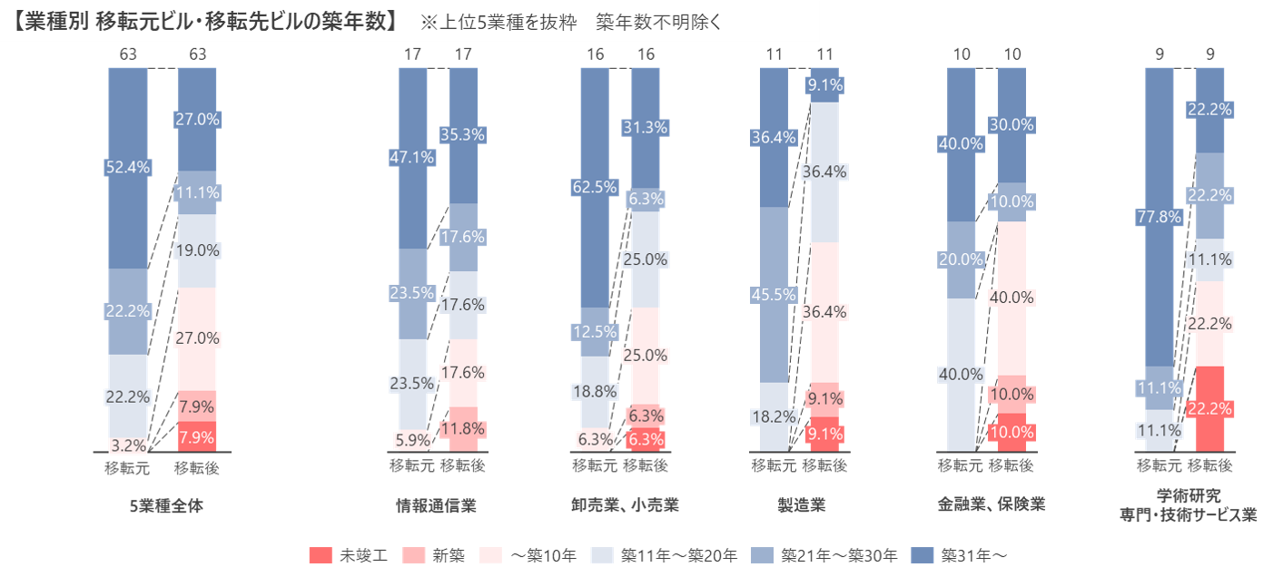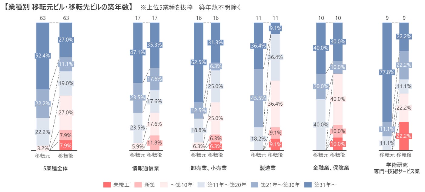 業種別に見ると、 「学術研究、専門・技術サービス業」では「未竣工」物件への移転が22%と、5業種の中で最も割合が高かった。大手建設コンサルタント企業においては、現入居ビルの建替えを理由に同一エリア内の竣工予定物件への拡張移転を発表している。また、「製造業」、「金融業、保険業」、においては、未竣工物件への移転は10%前後であるが、「未竣工~築10年」の物件への移転が50%を超えており、比較的築年数の浅い物件を選好する傾向が見られた。一方、「情報通信業」や「卸売業、小売業」では、「築11年~築31年以上」が過半数を占めた。