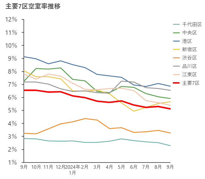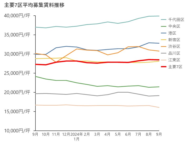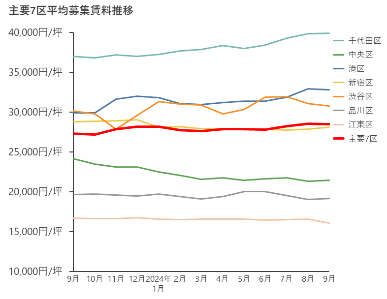 【2024年9月末時点の主要7区空室率・平均募集賃料の動向】