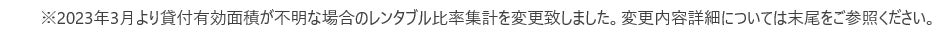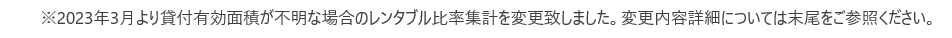 ※但し、貸付有効面積が不明である場合には、レンタブル比率(貸付有効面積/延床面積)を延床面積1万㎡以上の場合は50%、1万㎡未満は60%と設定し、集計しております。(2023年3月以前は、貸付有効面積が不明である場合には、同規模建物における実数値から求められたレンタブル比率を適用し集計を実施)