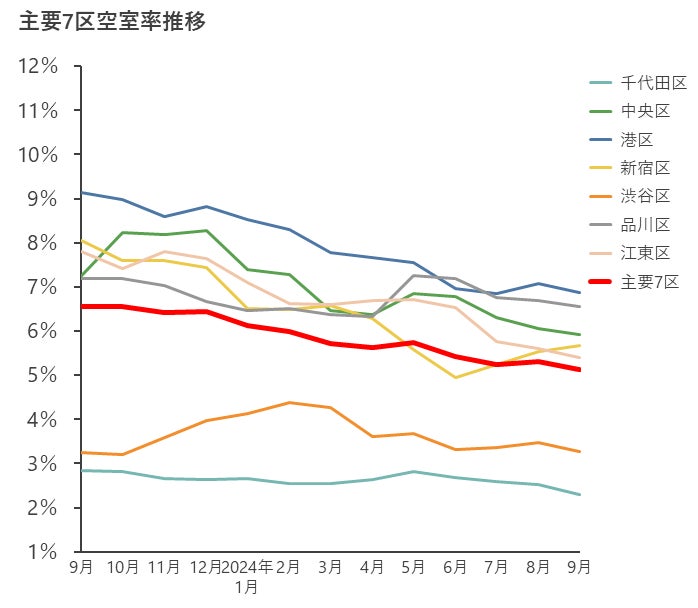 主要7区の空室率について、千代田区、港区、江東区で回復、中央区、新宿区・渋谷区・品川区で横ばいとなった。主要7区の空室率は、回復傾向となっており、直近では5.13%となった。また、主要5区の空室率は、2023年のオフィスビル大量供給の影響もあり一時6.88%まで上昇したが、その後は順調に回復し、直近では2021年1月(44か月)ぶりに5%台を切り、4.94%となった。