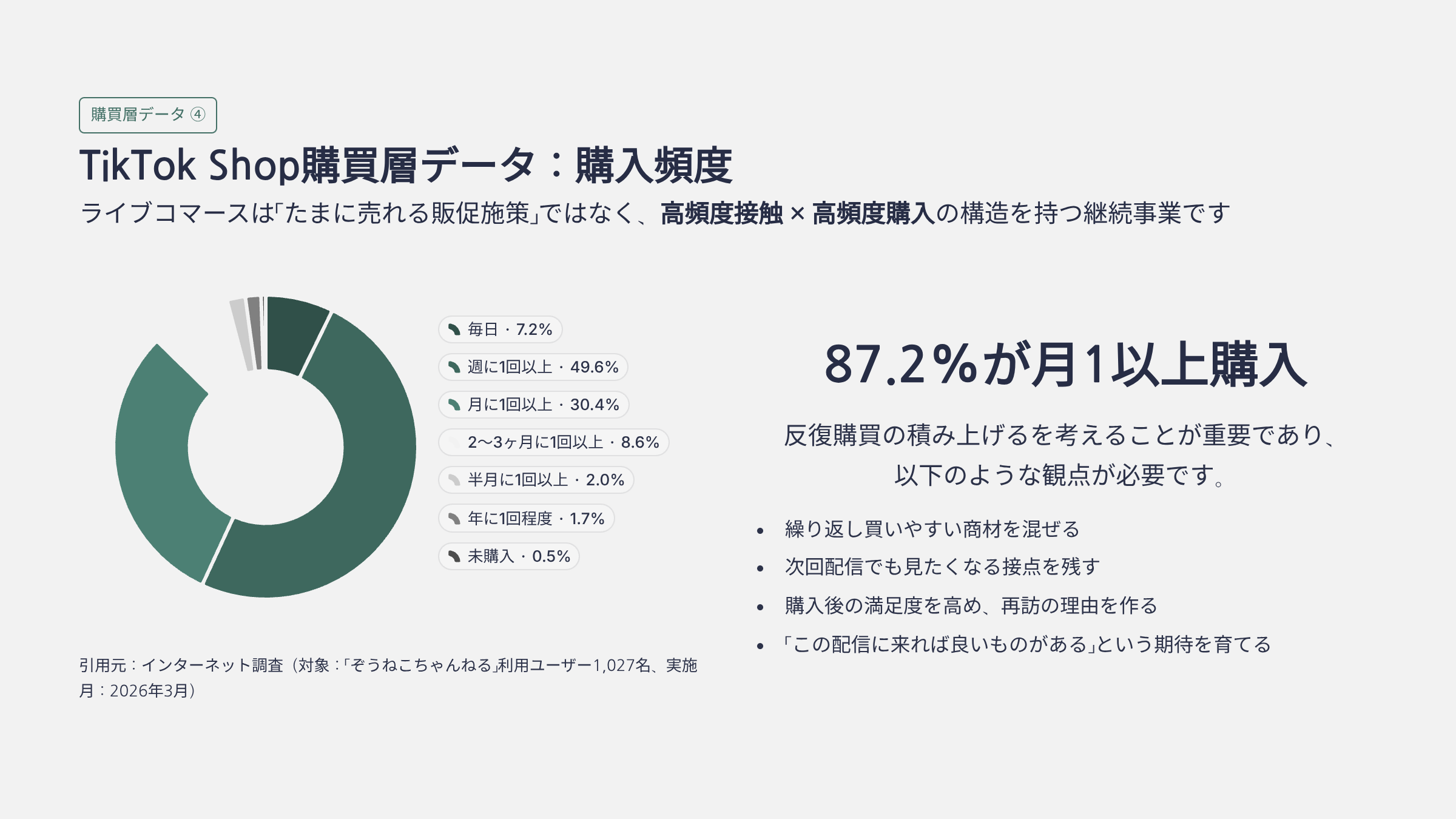 また、購入頻度では87.2%が月1回以上購入しており、ライブコマースが単発の販促施策ではなく、高頻度接触と反復購買が生まれる継続的な事業モデルであることが示されています。