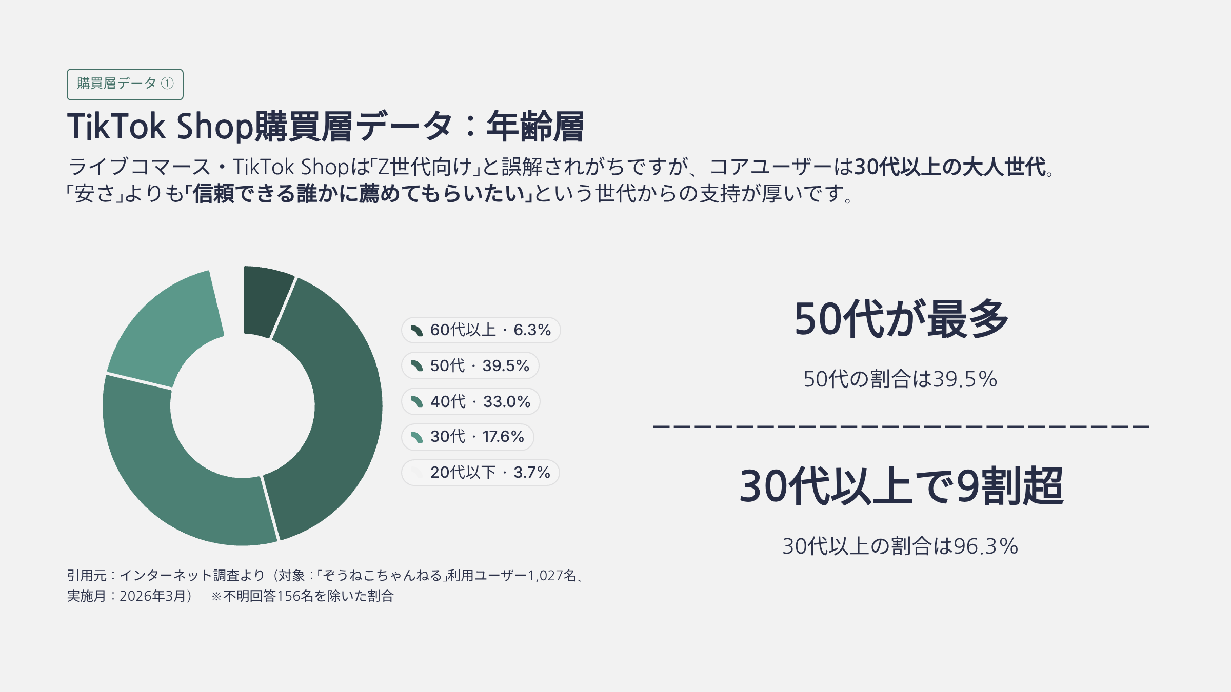 また、資料内ではTikTok Shop購買層データとして、「ぞうねこちゃんねる」利用ユーザー1,027名を対象としたインターネット調査結果も掲載しています。購買層の年齢・性別・視聴頻度・購入頻度を整理することで、日本におけるライブコマース市場の実態理解にもつながる内容となっています。