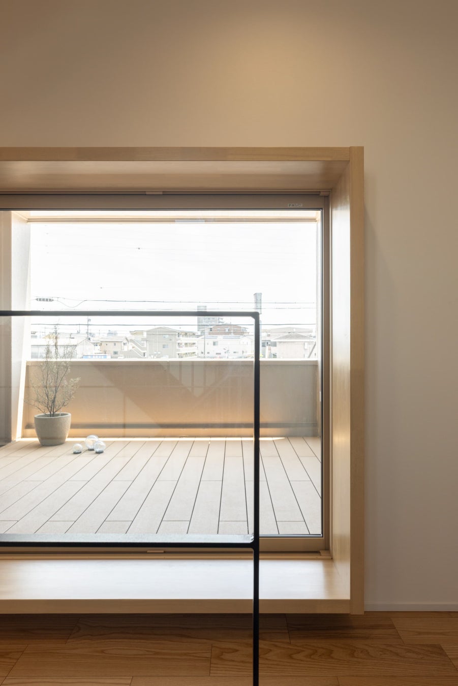 玄関とは別に、居室の入口に第二の玄関扉のような造作扉を設置。扉横にはFIXガラスを組み合わせることで、空間を仕切りつつ、人の気配や光を感じられるデザインになっています。