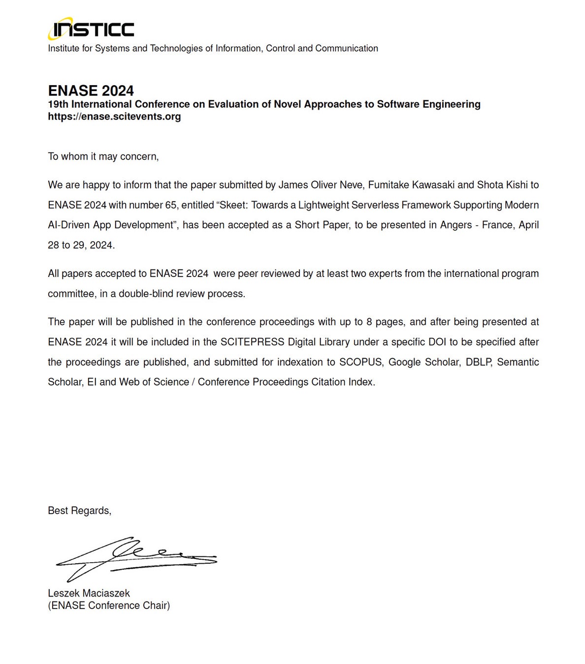 その後本論文は ENASE 2024 の学会誌に収録・出版を予定されており、Google Scholar や Scopus をはじめとした複数の主要学術文献検索サービスに登録(Index)されます。