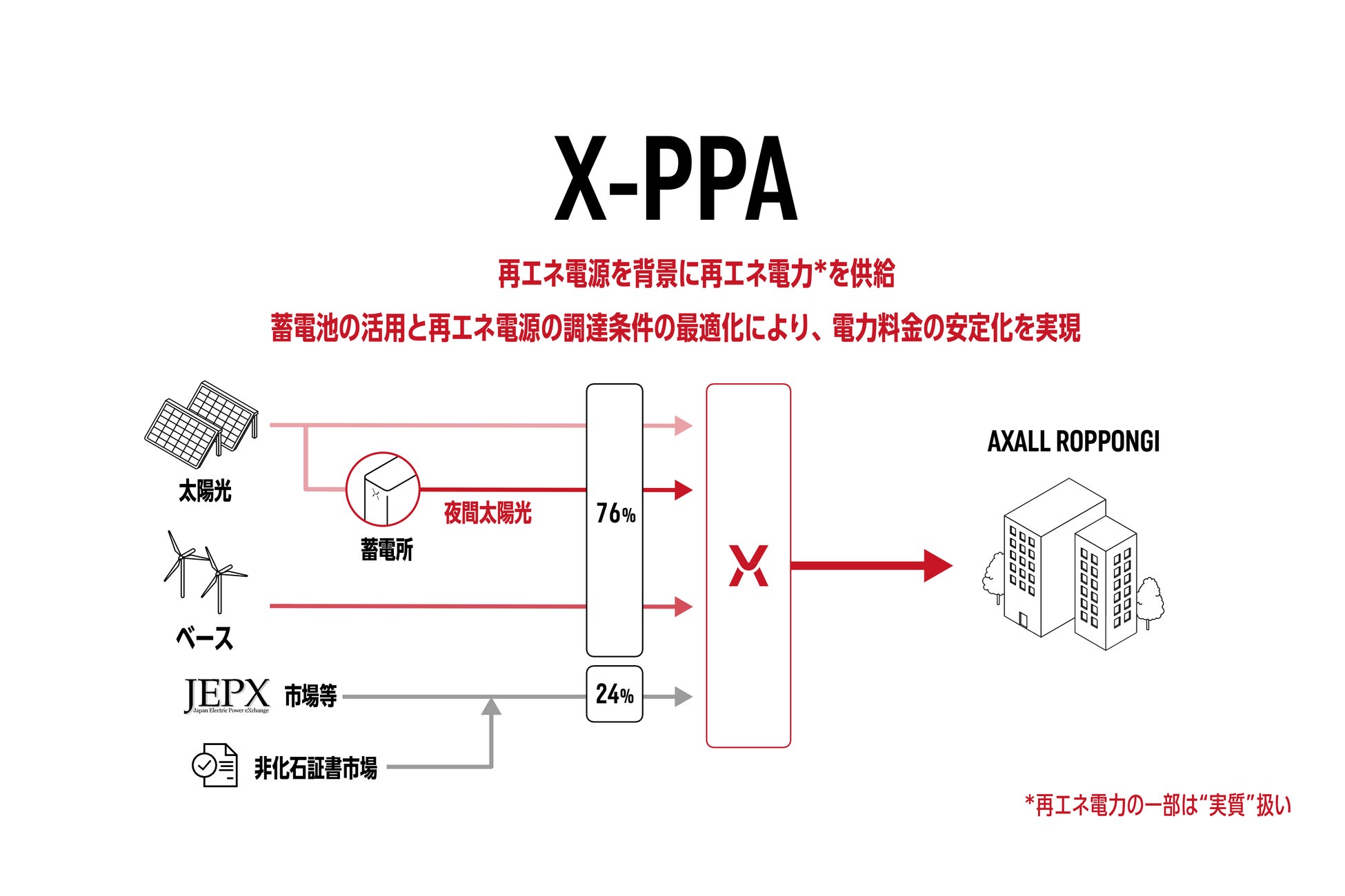 今回、「AXALL ROPPONGI」に供給される電力は、約76%が追加性※1のある再生可能エネルギー電源から調達され、非FIT非化石証書(再生可能エネルギー指定)を通じて電力に組み入れられます。当サービスの導入することで、当施設の電力調達が新たな再生可能エネルギー電源の普及拡大に大きく貢献します。