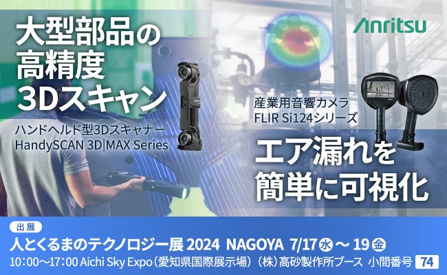 アンリツ株式会社(社長 濱田 宏一)は、CREAFORM社のハンドヘルド型3Dスキャナー『HandySCAN 3D|MAX Series』及びTeledyne FLIR社の産業用音響カメラ『FLIR Si124』を、2024年7月17日から7月19日までAichi Sky Expo(愛知県国際展示場)にて開催される『人とくるまのテクノロジー展 2024 NAGOYA』の株式会社高砂製作所のブースで、実演を交えて出展します。