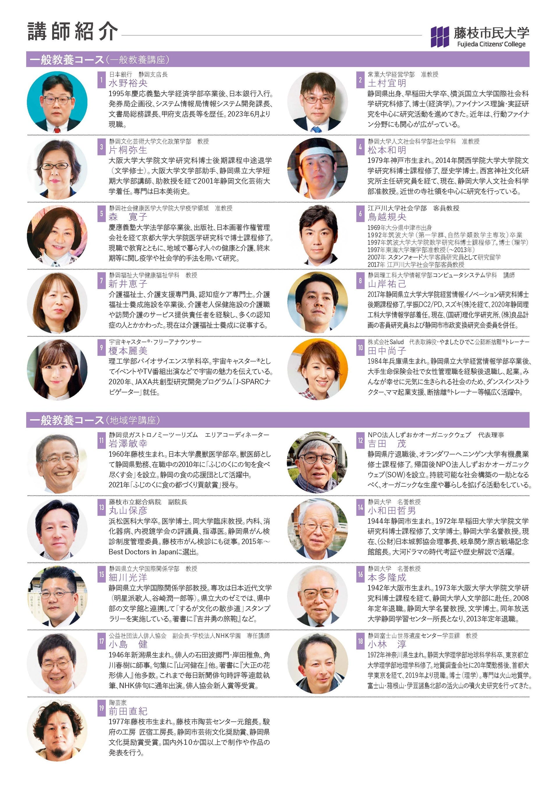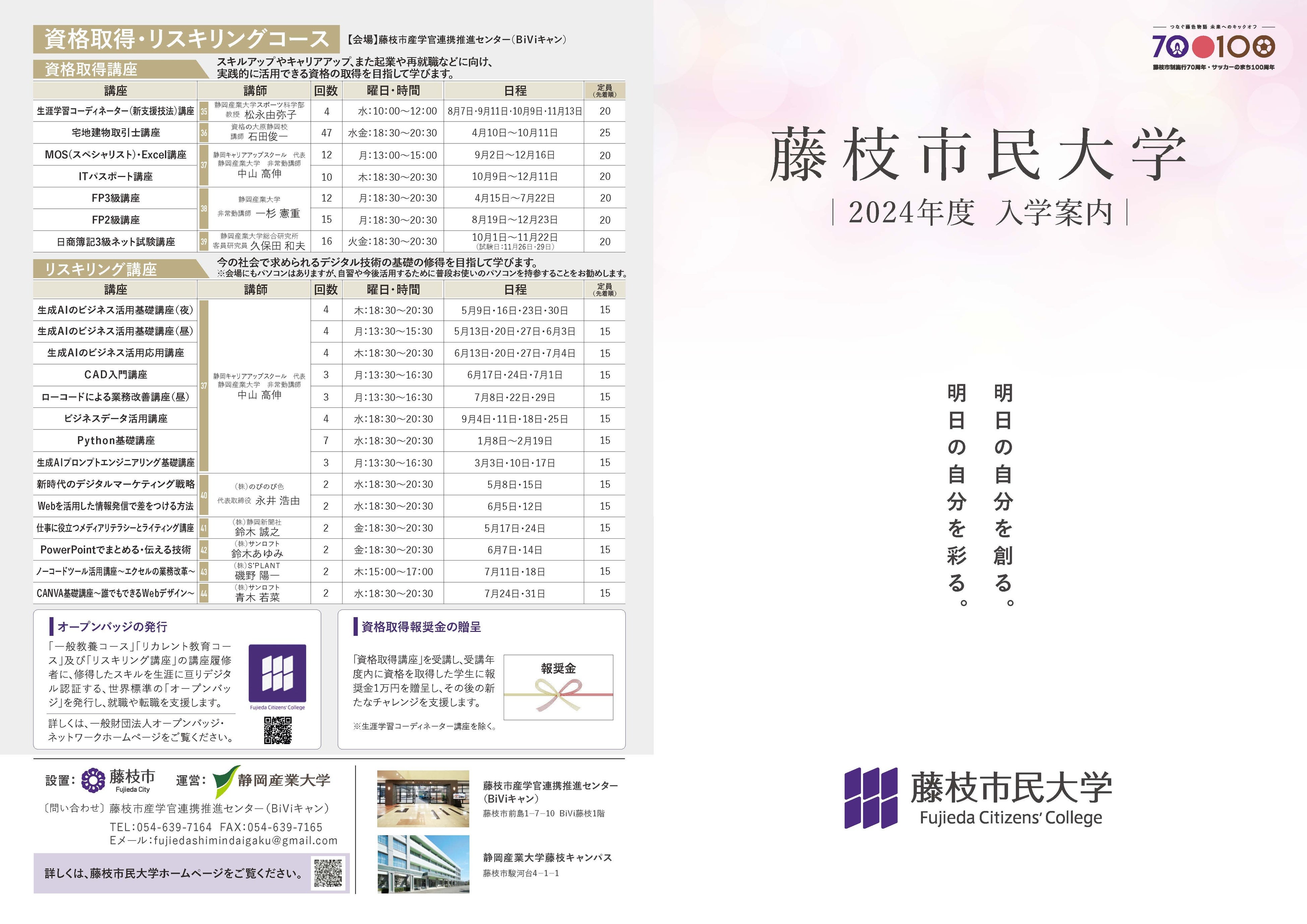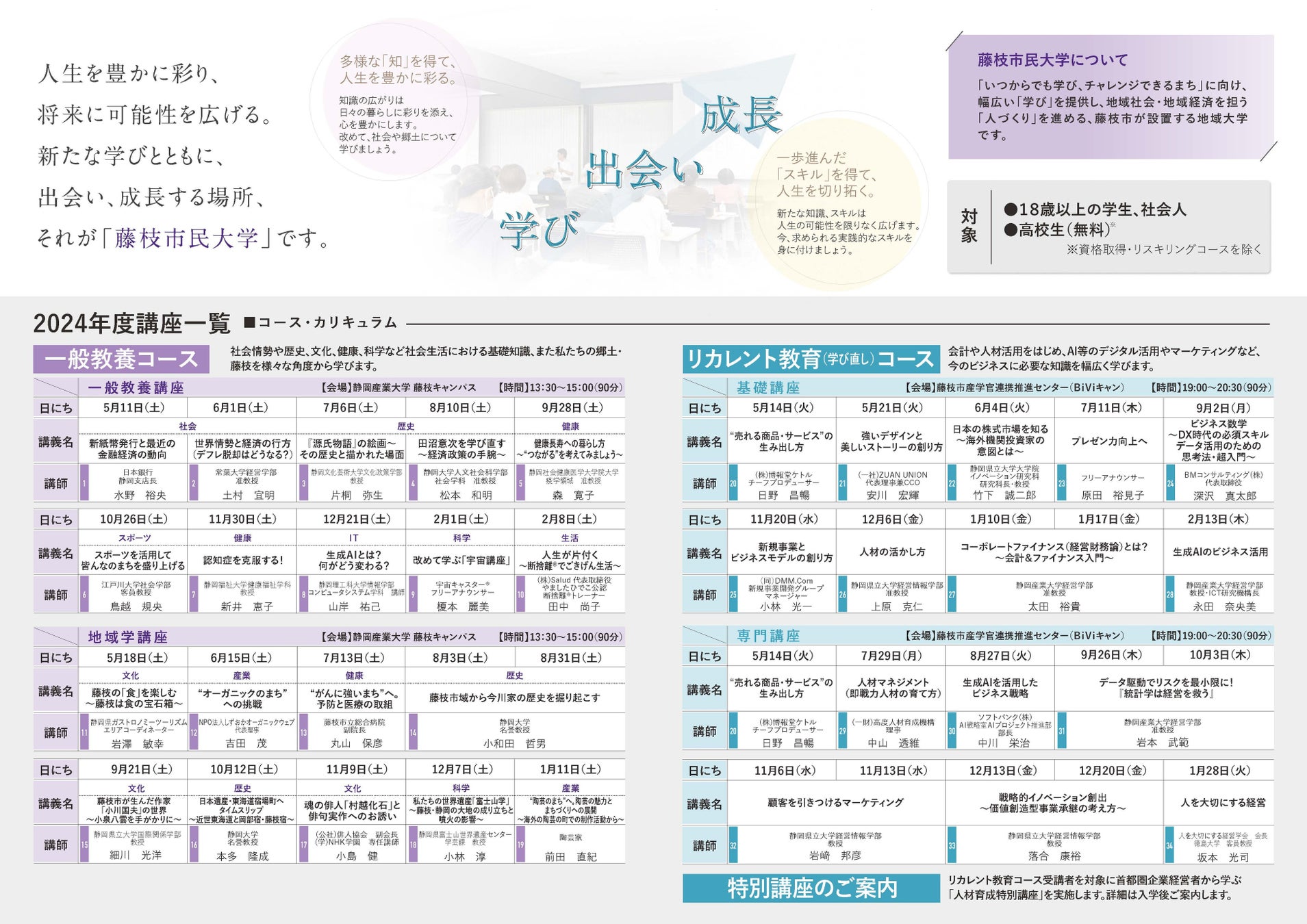 郷土藤枝の歴史や文化に加え、最新の社会情勢や話題の事柄、将来のまちの方向性に関わる学びを提供することにより生活を豊かにし、「いつからでも学び、チャレンジできるまち」の実現を目指します。
