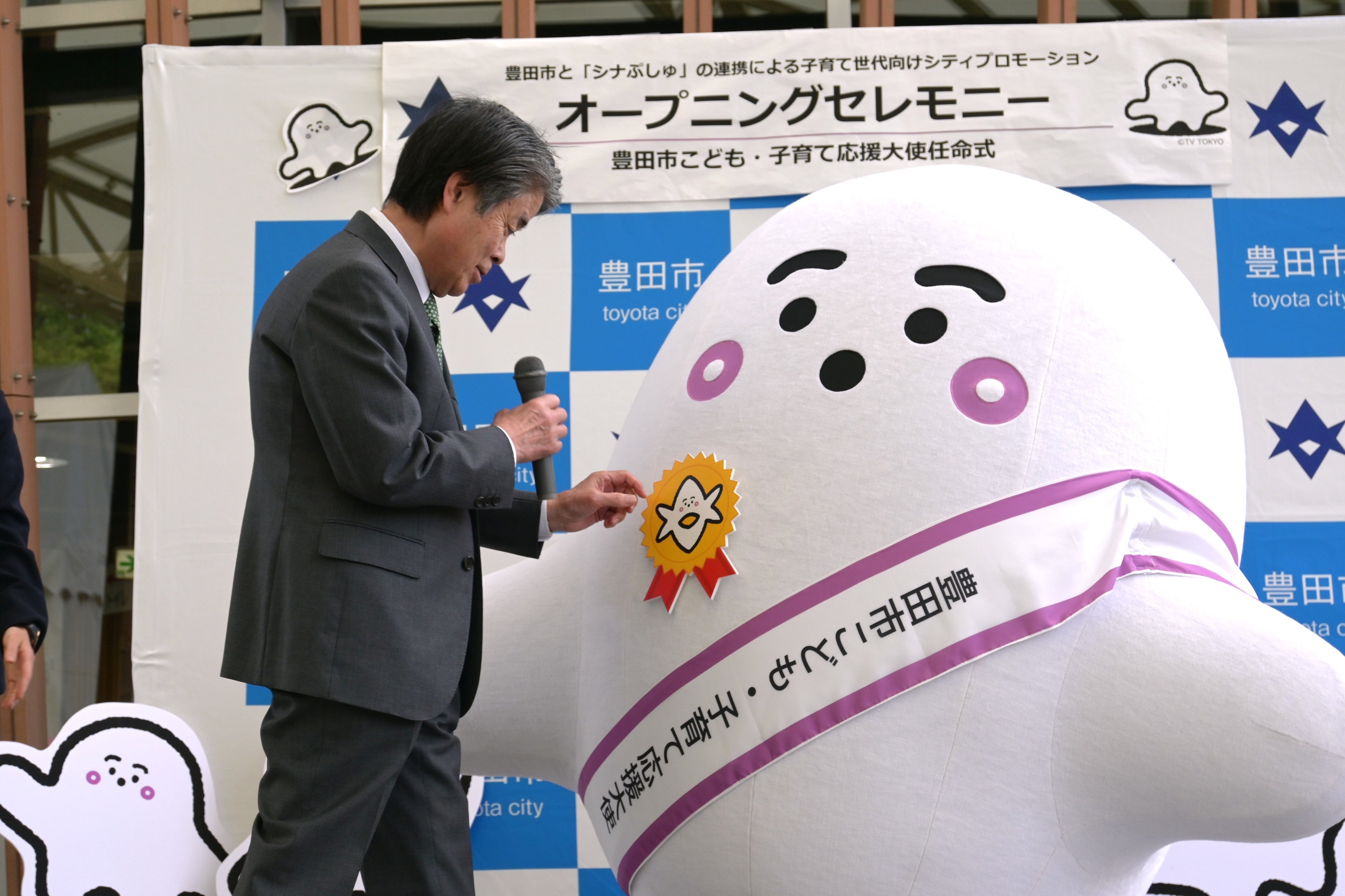 また、オープニングセレモニーでは、豊田市の市章の形に変身したぷしゅぷしゅと応援大使のタスキをかけたぷしゅぷしゅのイラストを用いた、豊田市と「シナぷしゅ」のタイアップアイコンのお披露目も行いました。
