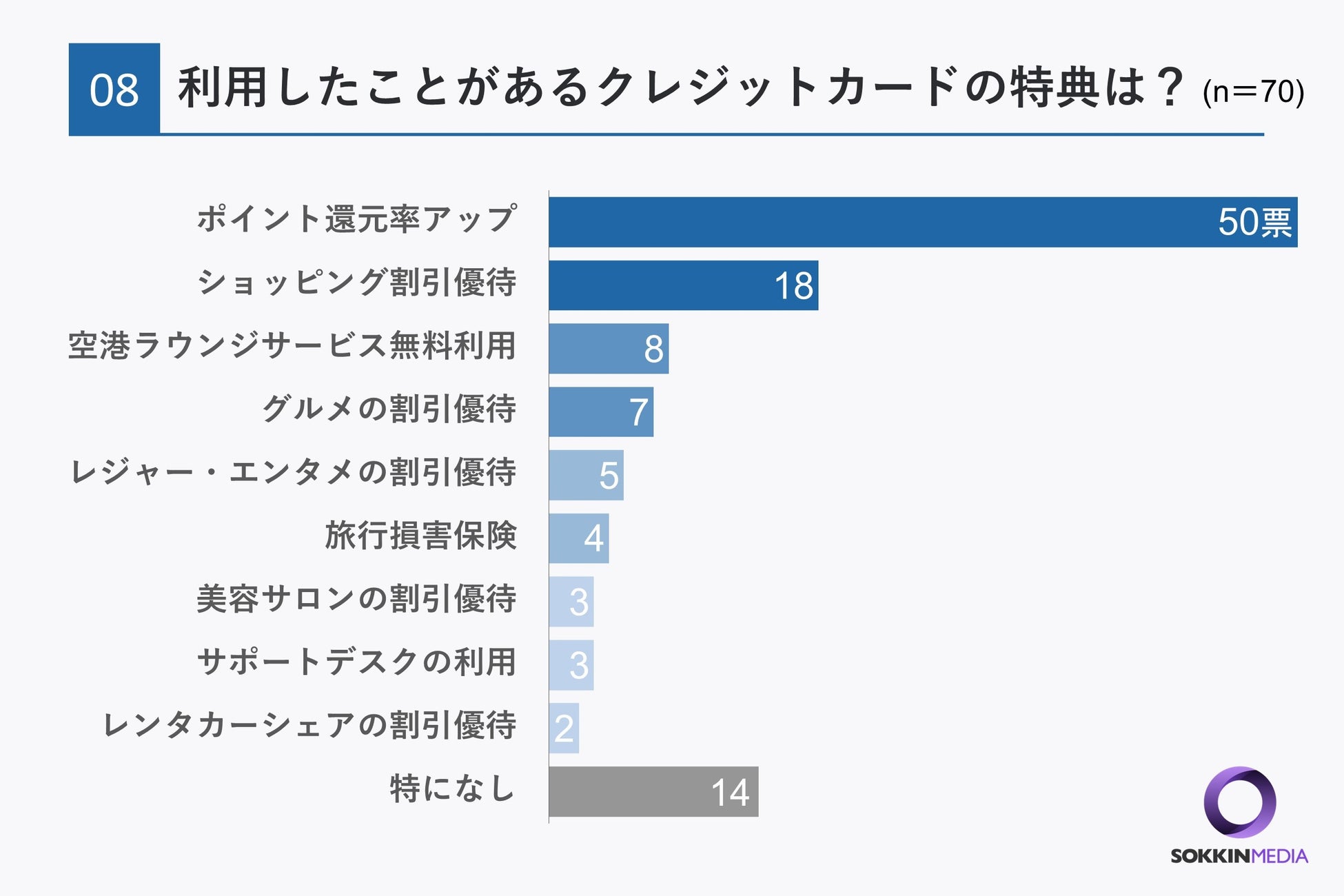 「Q8. 利用したことがあるクレジットカードの特典は?」という問いに対して、「ポイント還元率アップ」が最多の50票でした。次いで「ショッピング割引優待」、「空港ラウンジサービス無料利用」などの回答が多く見られました。