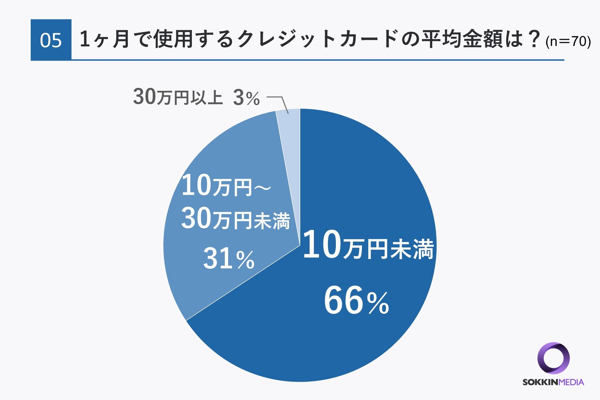 「Q5. 1ヶ月で使用するクレジットカードの平均金額は?」という問いに対して、「10万円未満」という回答が66%で最多でした。次いで「10万円以上30万円未満」が31%という結果になりました。