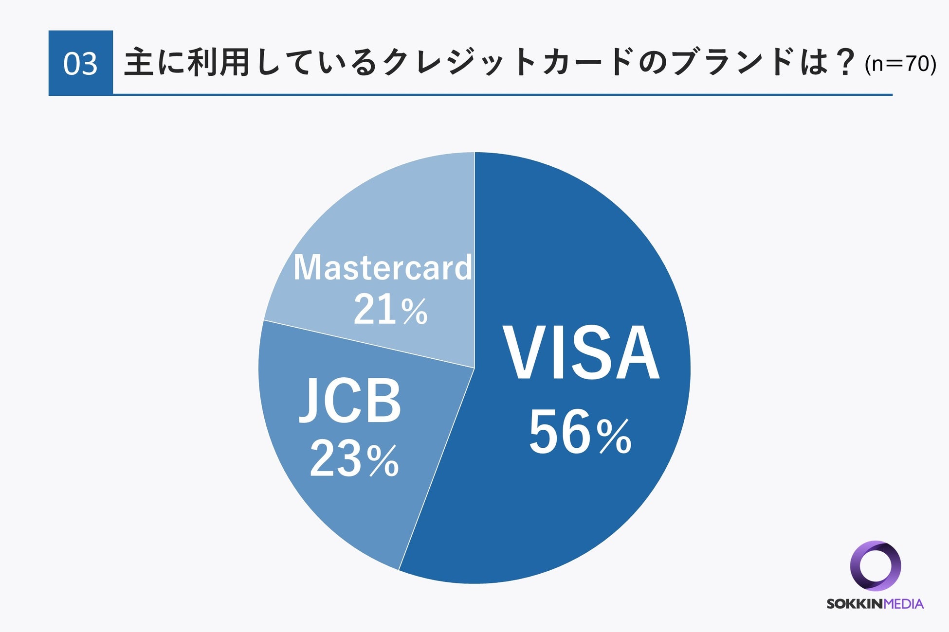 「Q3.主に利用しているクレジットカードのブランドは?」という問いに対して、「VISA」と回答した方が最多で56%という結果になりました。次いで「JCB」が23%、「Mastercard」が21%でした。
