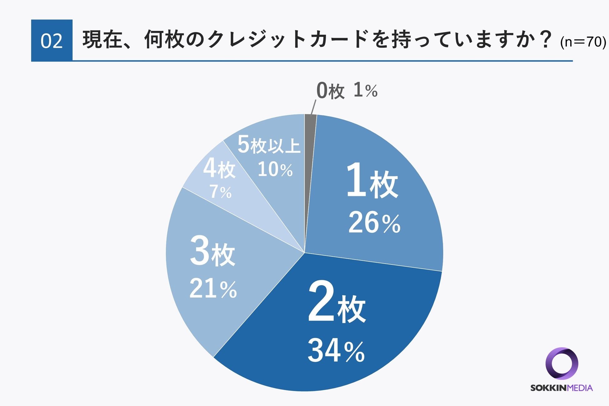 「Q2. 現在、何枚のクレジットカードを持っていますか?」という問いに対して、「2枚」と回答した方の割合が34%と最も多く、次いで「1枚」が26%という結果になりました。