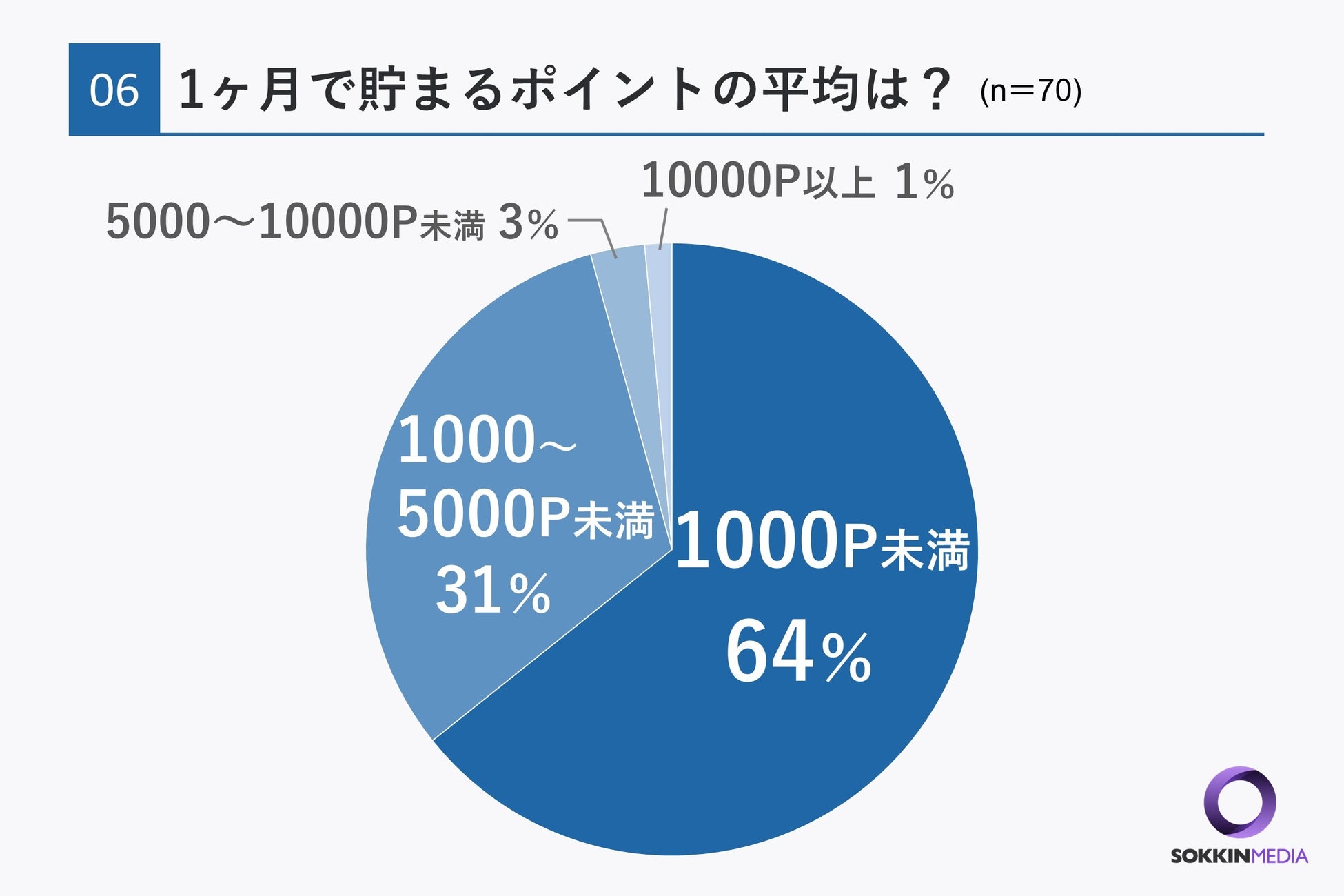 「Q6. 1ヶ月で貯まるポイントの平均は?」という問いに対して、「1,000ポイント未満」が最も多く64%、次いで「1,000ポイント以上5,000ポイント未満」が31%という結果になりました。