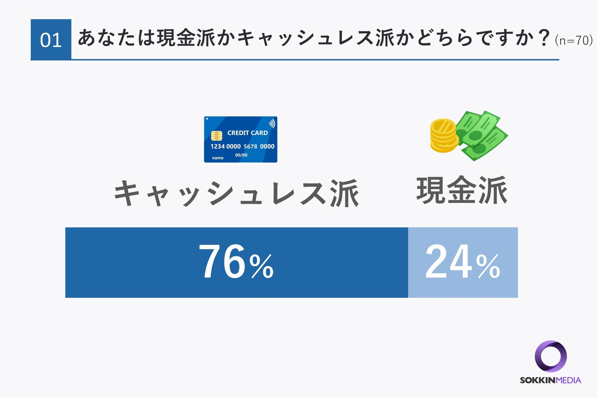 「Q1.あなたは現金派かキャッシュレス派かどちらですか?」という問いに対して、「キャッシュレス派」の方の割合が76%、「現金派」の方の割合は24%という結果になりました。