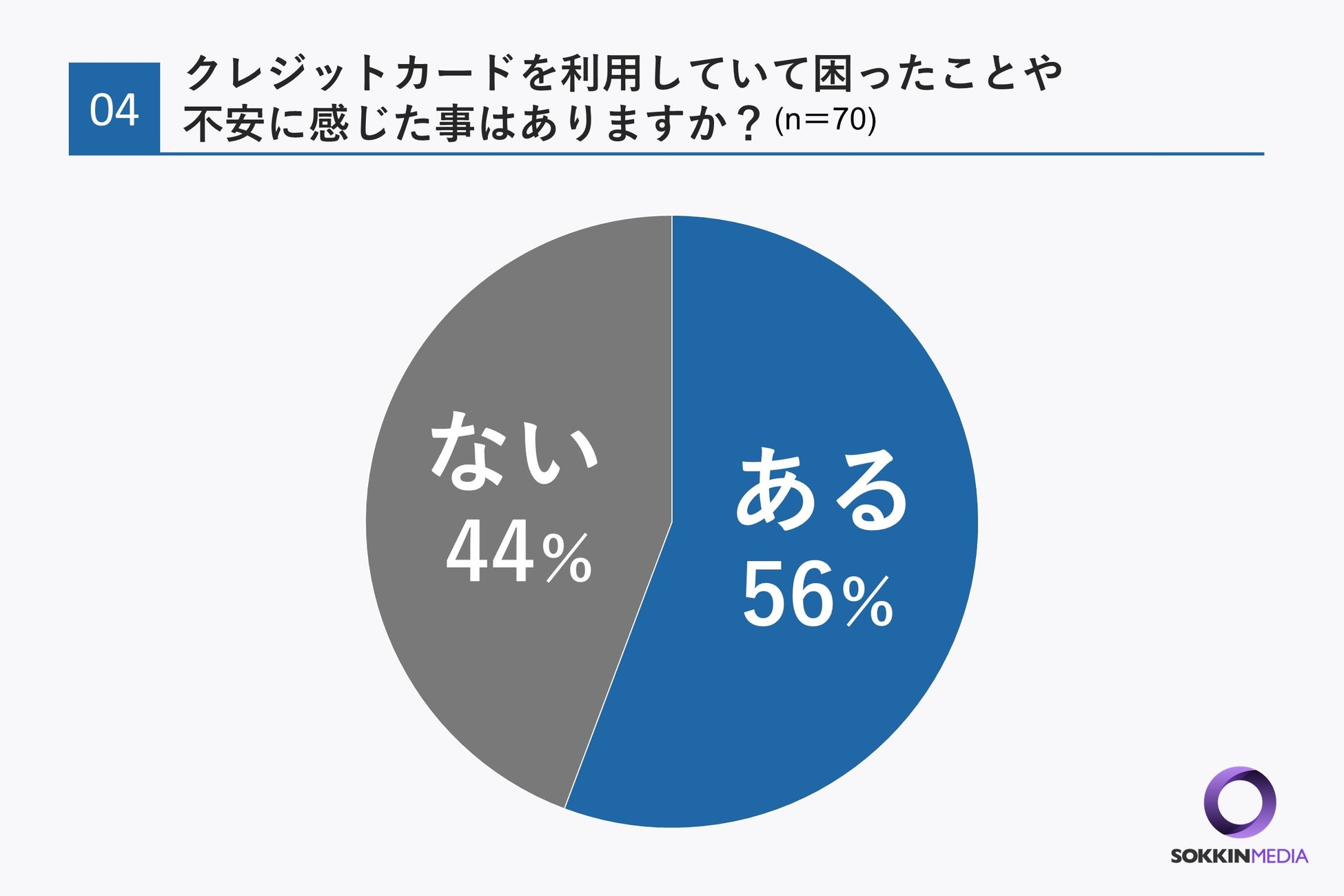 「Q4.クレジットカードを利用していて困ったことや不安に感じたことはありますか?」という問いに対して、56%の方が「ある」と回答しました。「ない」という回答は44%でした。