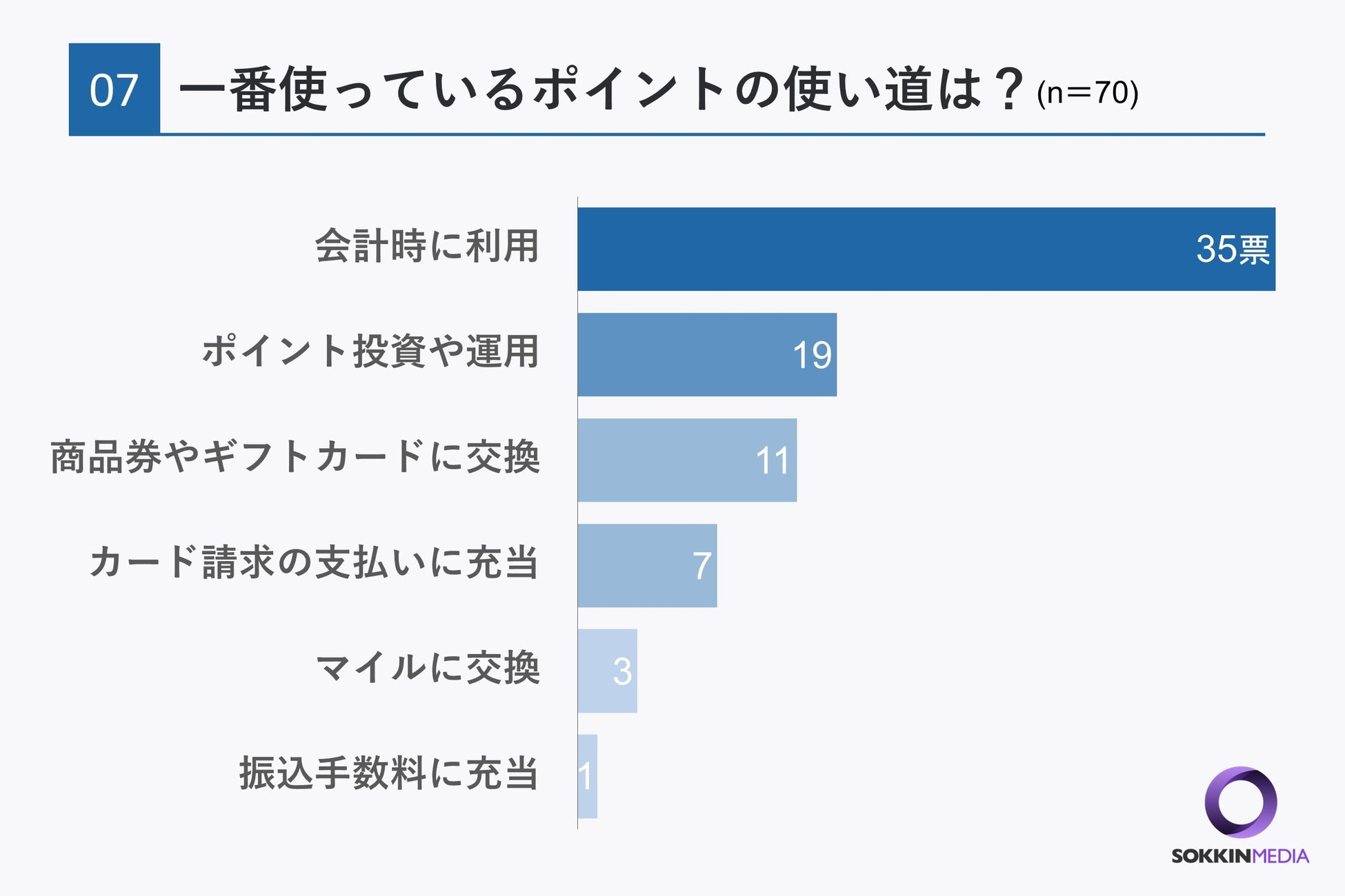 「Q7. 一番使っているポイントの使い道は?」という問いに対して、「会計時に利用」が最多の35票、次いで「ポイント投資や運用」が19票という結果になりました。