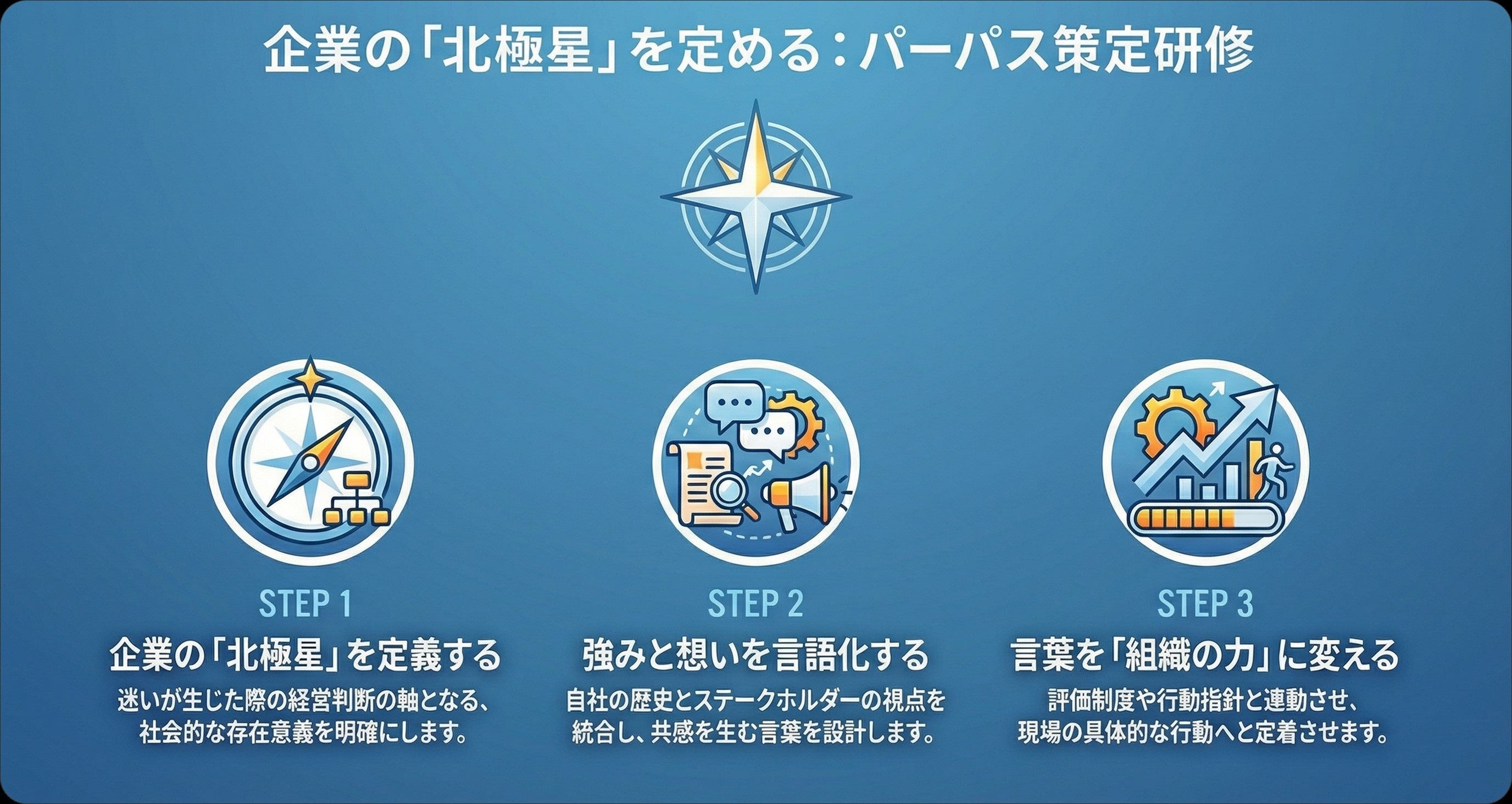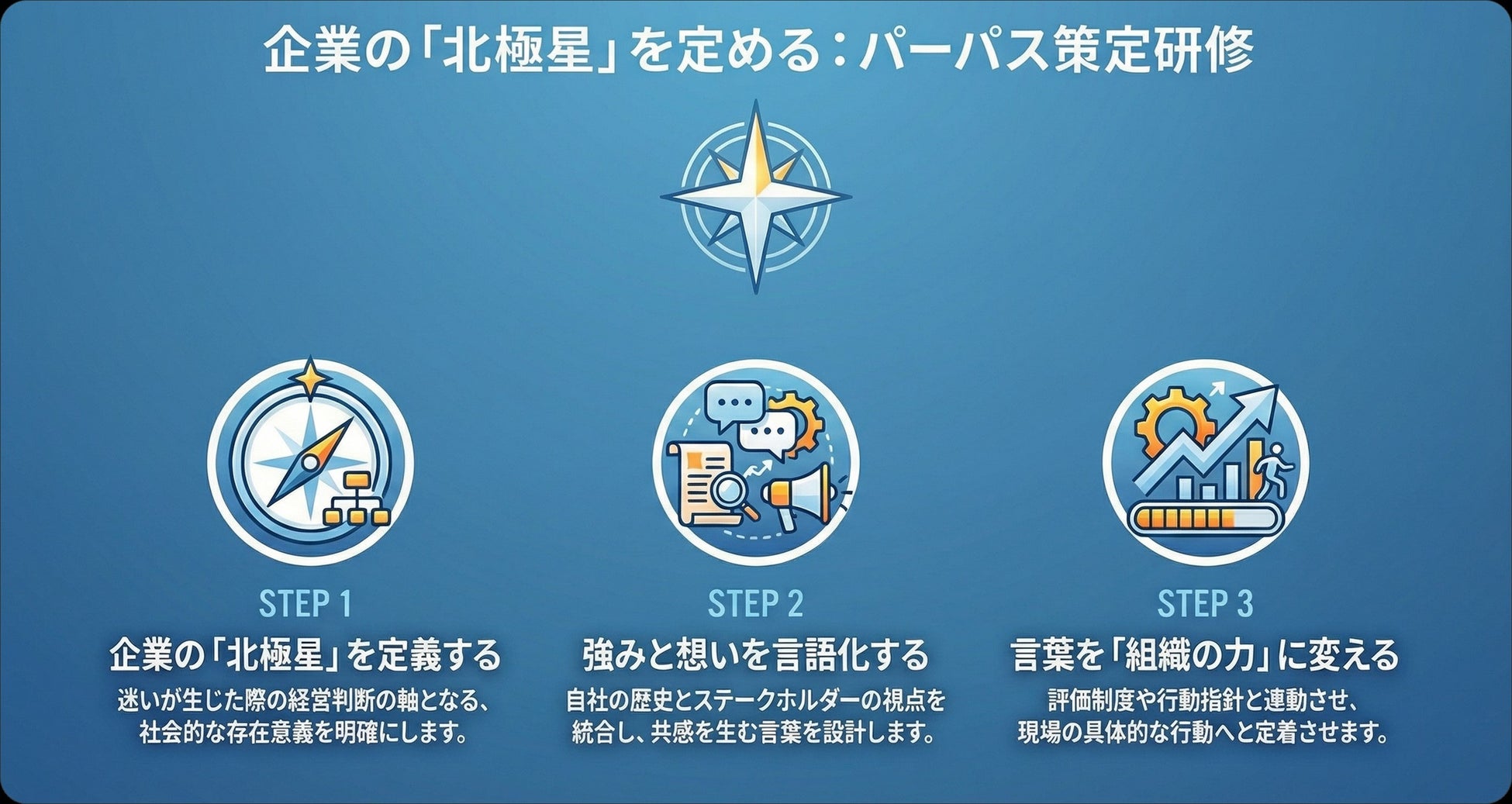 自社の存在意義を再定義し、それを経営戦略や組織文化へ反映させるための具体的な策定・浸透スキルを習得します。経営判断の質と速度を向上させ、組織力を強化することを目的としています。