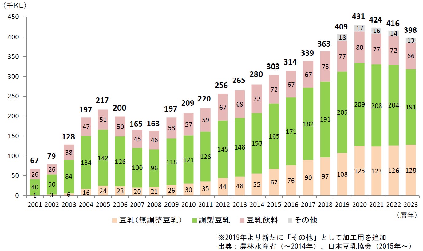 2023 年の豆乳の国内生産量は、39.8 万KL でした。