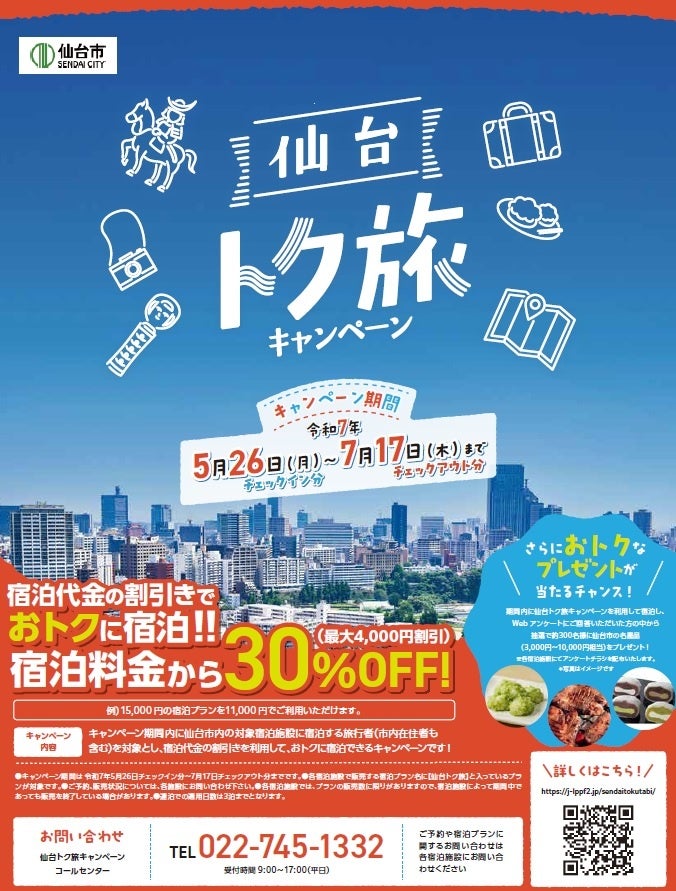 2025年5月7日から、仙台市内の宿泊施設を対象に、1人1泊当たり宿泊代金の30%(最大4,000円)の割引を適用する、お得なプランを販売します。詳細は特設ホームページをご覧ください。