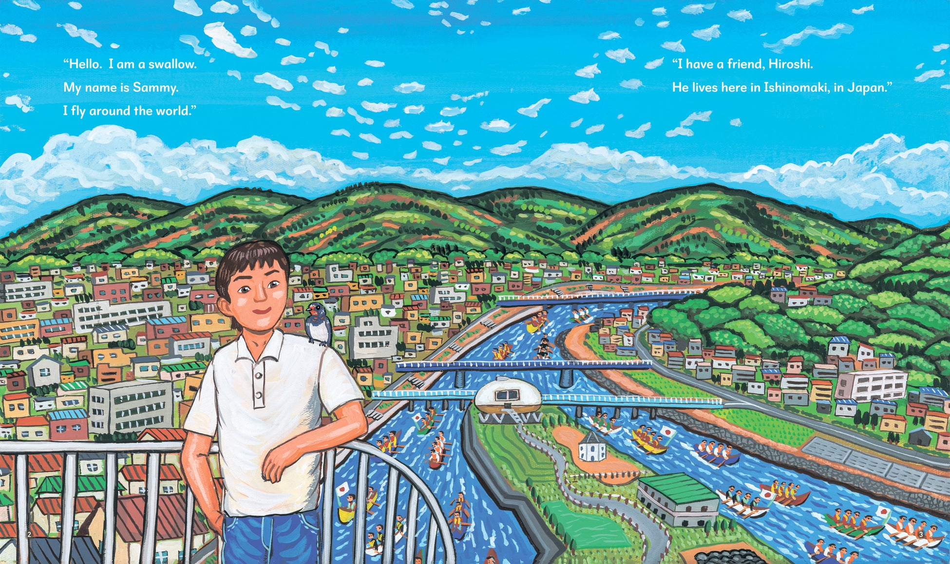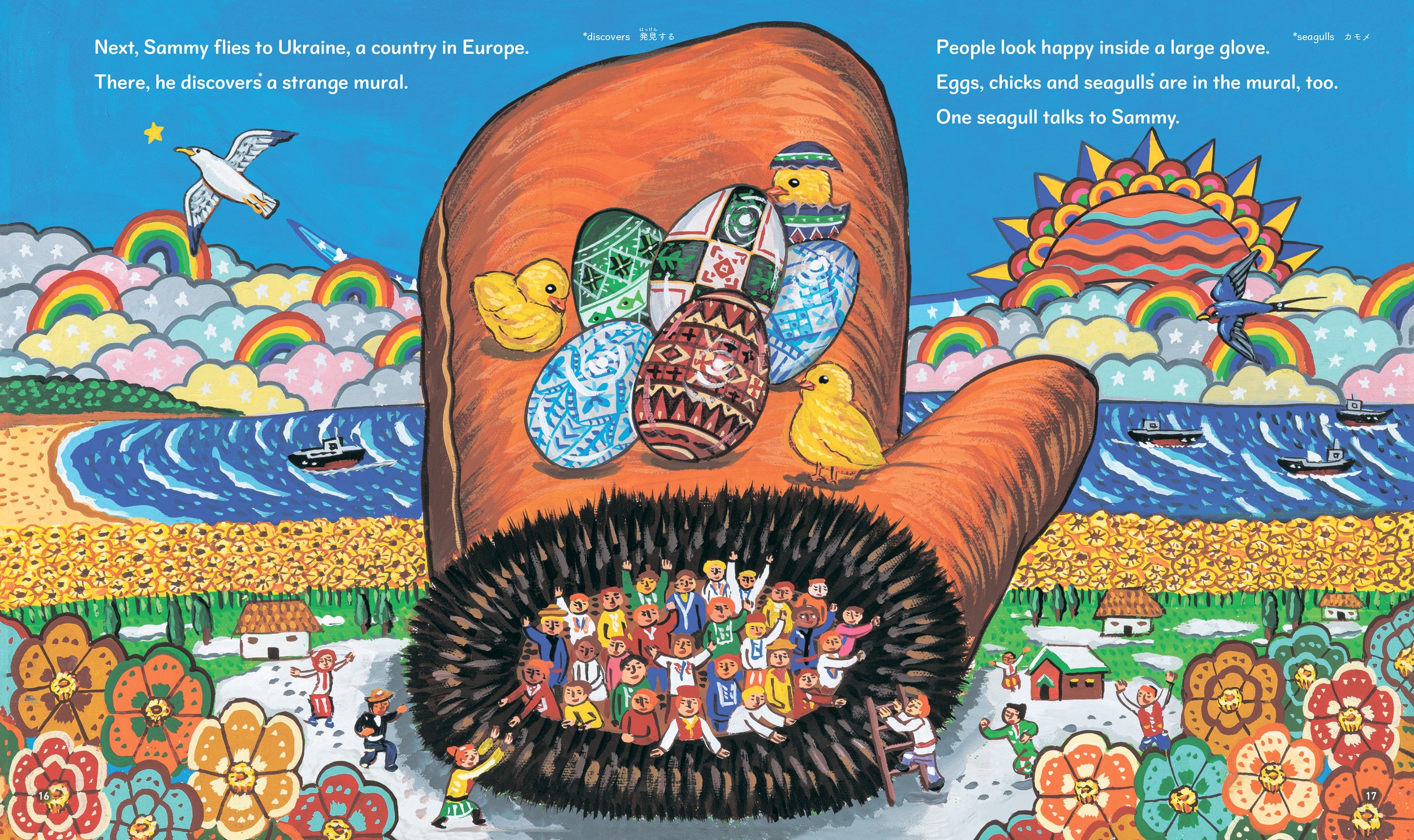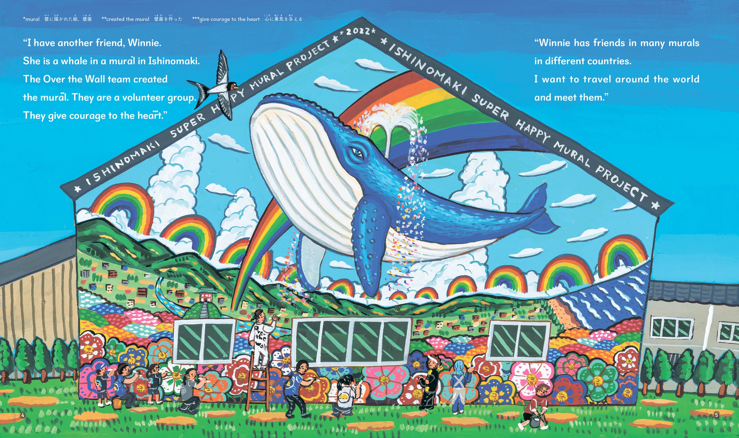 石巻にはOver the Wallチームが作成した壁画のひとつがあり、その絵の中にいるクジラのウィニーから、サミーは世界中の壁画の中の友だちを紹介されます。