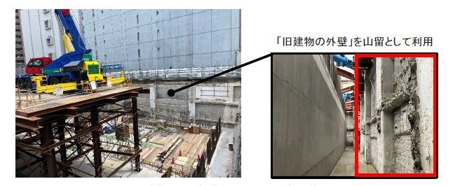 ・旧建物の地下躯体を山留として有効利用し、基礎杭および掘削・山留数量を削減