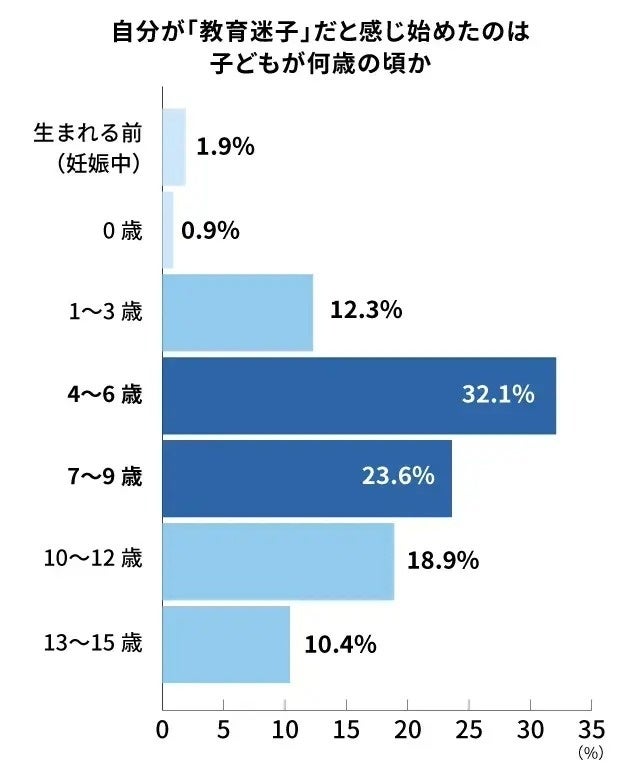 教育迷子を自覚し始めた時期についても尋ねました。結果、「生まれる前」「0歳」「1歳~3歳」「4~6歳」の就学前時期の回答の合計が47.2%でした。