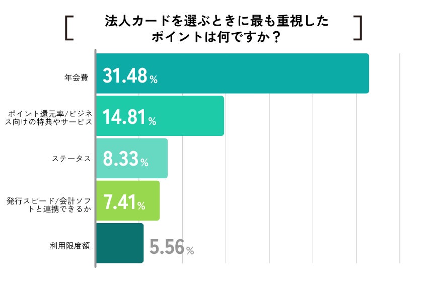 法人クレジットカード選ぶときに最も重視したポイントとして、「年会費」と回答した人が31.48%と最多だった。