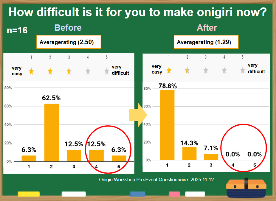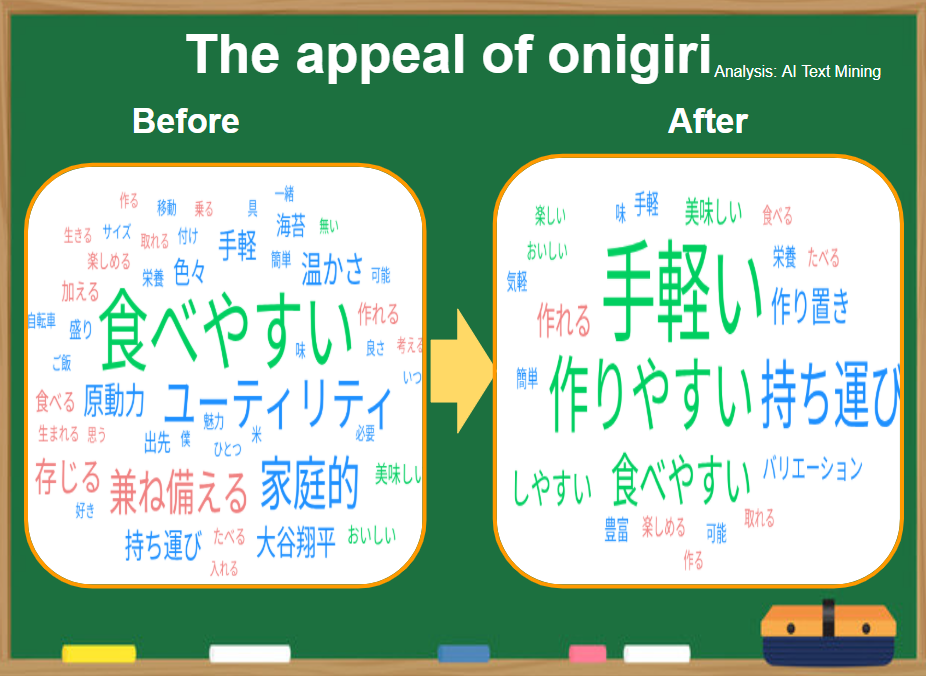 ワークショップ後は参加者全員がハードル低下を実感し、「自分でも作りたい」という意欲も100%に達しました。AIテキストマイニングでは、参加者の意識が「食べるおにぎり」から「作るおにぎり」へと変化したことも確認されています。