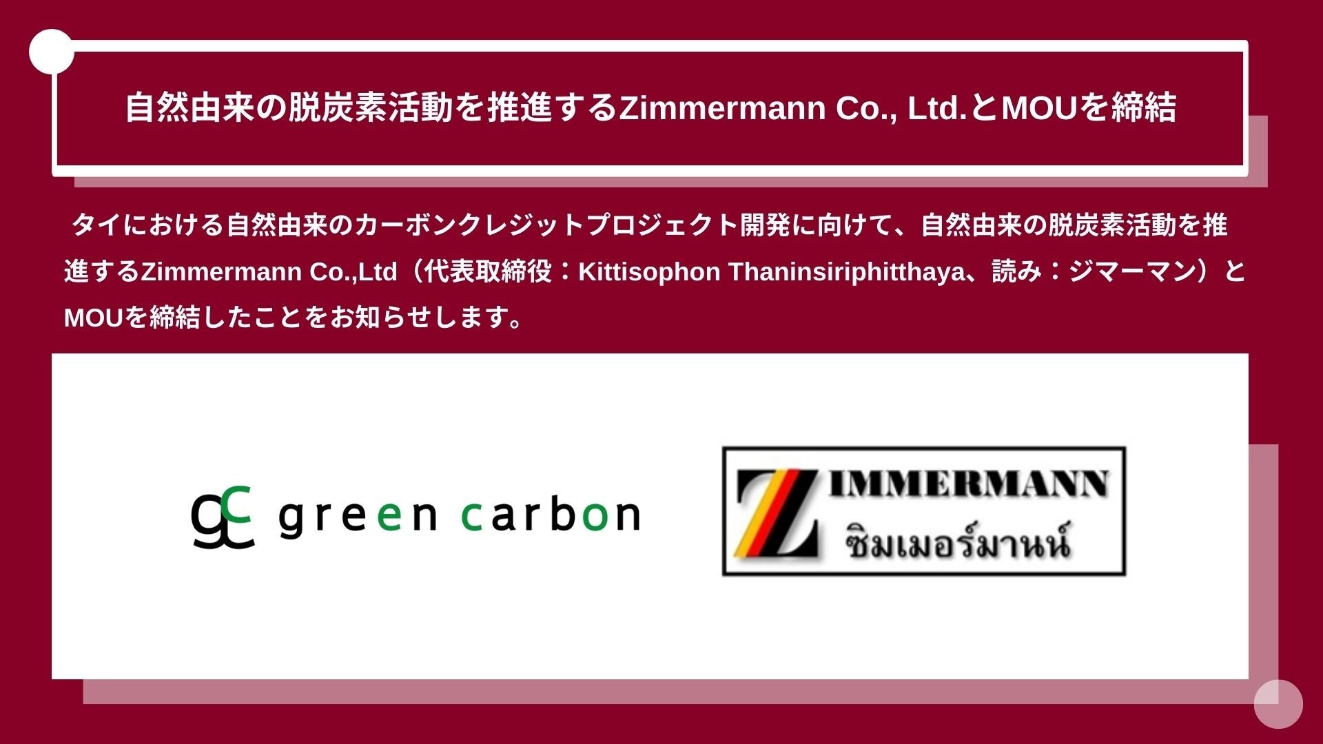 Green Carbon株式会社(代表取締役:大北潤、以下Green Carbon(読み:グリーンカーボン))はこの度、タイにおける自然由来のカーボンクレジットプロジェクト開発に向けて、自然由来の脱炭素活動を推進するZimmermann Co.,Ltd(代表取締役:Kittisophon Thaninsiriphitthaya、以下Zimmermann)とMOUを締結したことをお知らせします。