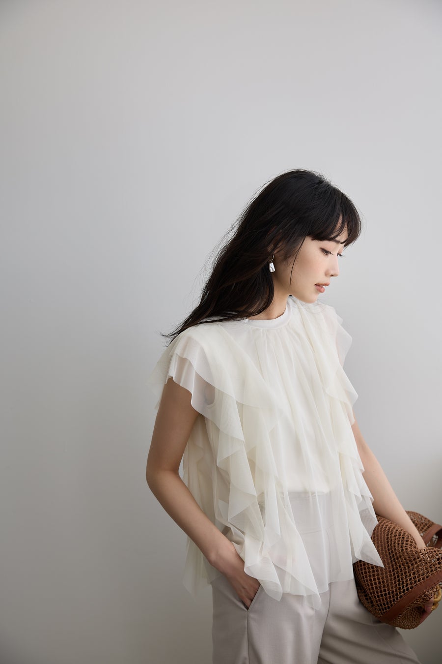 4. 真夏も涼しいドライな肌触り。旬のチュールをあしらったティアードニット