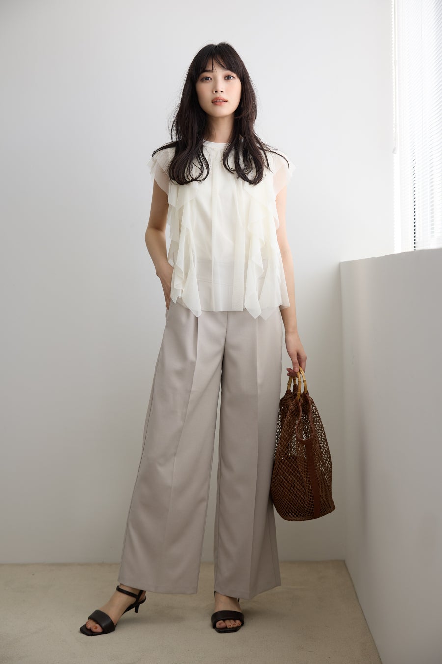 8. ジャケットインにも活躍。シンプルなワンツーコーデが華やぐフリルチュールカットソー