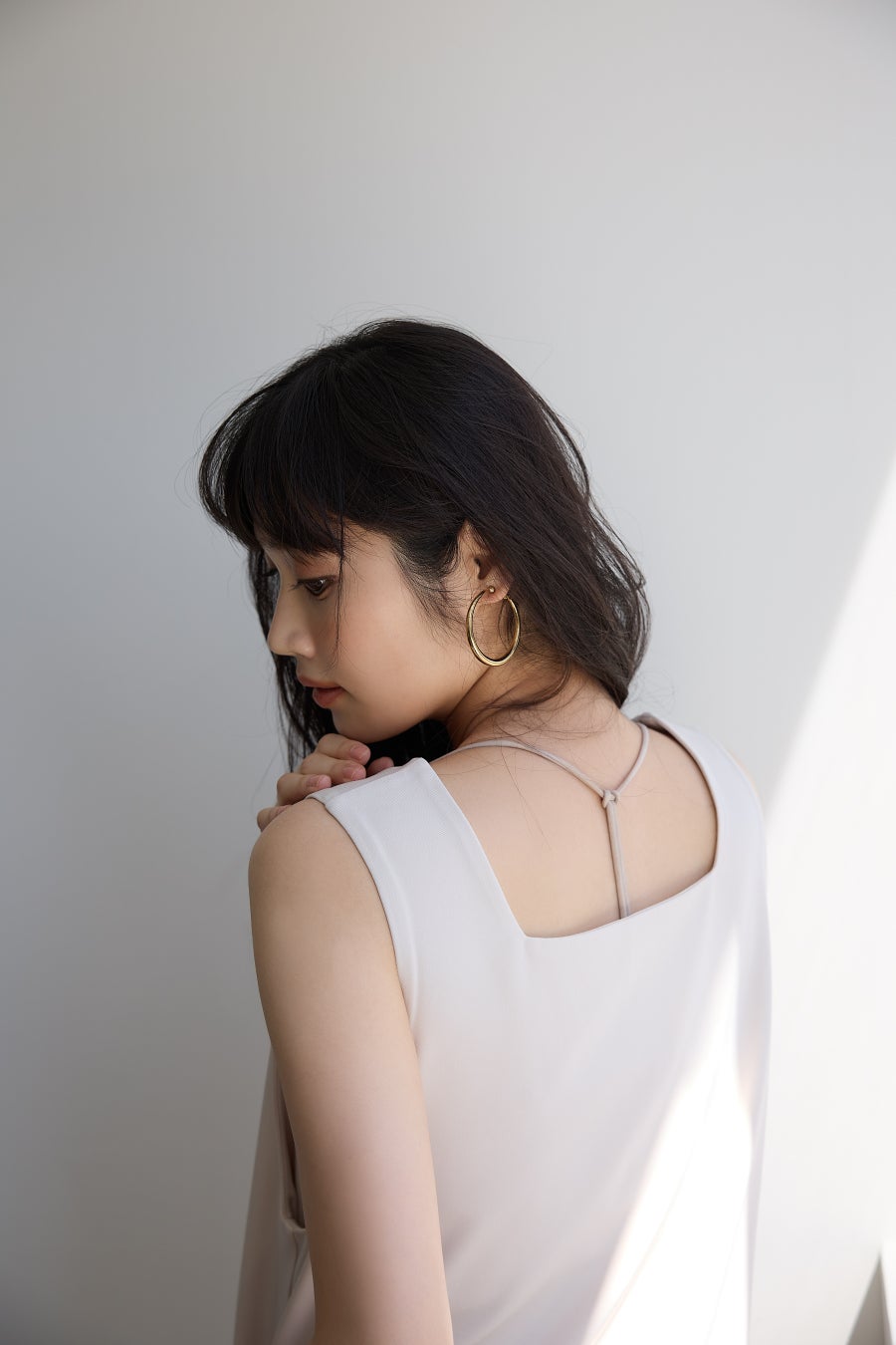 5. ストラップとアメリカンスリーブデザインで肩周りを華奢に。バックサテンのカラーワンピース