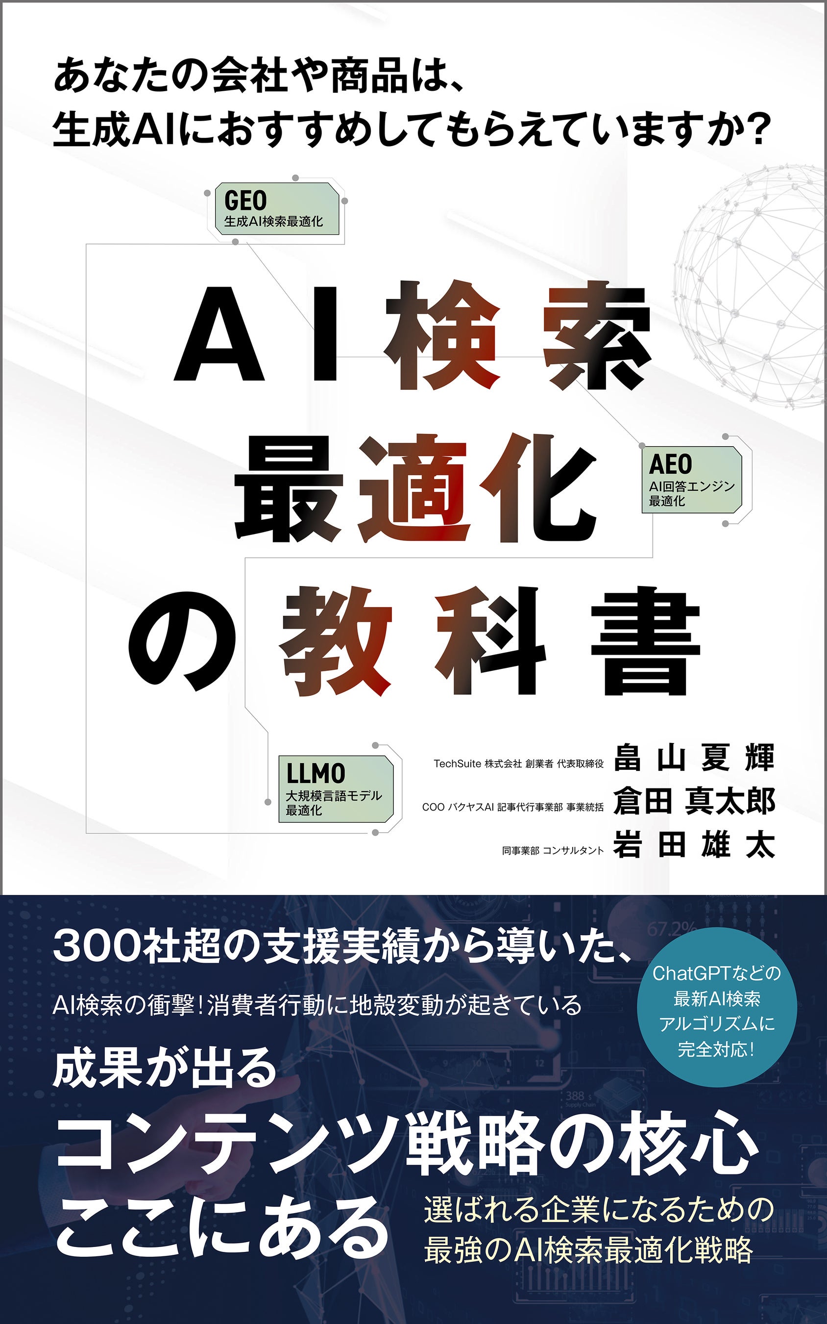 TechSuite株式会社(本社:東京都港区芝浦四丁目19番1号芝浦アークビル2階、代表取締役:畠山夏輝)は、新刊『AI検索最適化の教科書: 選ばれる企業になるための最強のAI検索最適化戦略(TechSuite Books)』をAmazonにて発売しました。