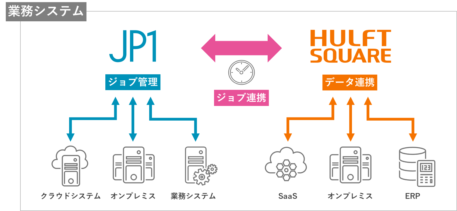 これにより、「JP1」シリーズである「JP1/Automatic Job Management System 3」および「JP1 Cloud Service/Job Management」のジョブ管理に「HULFT Square」のデータ連携機能を一体化することができ、企業の業務処理全体を統合的に制御し一括管理が可能となります。